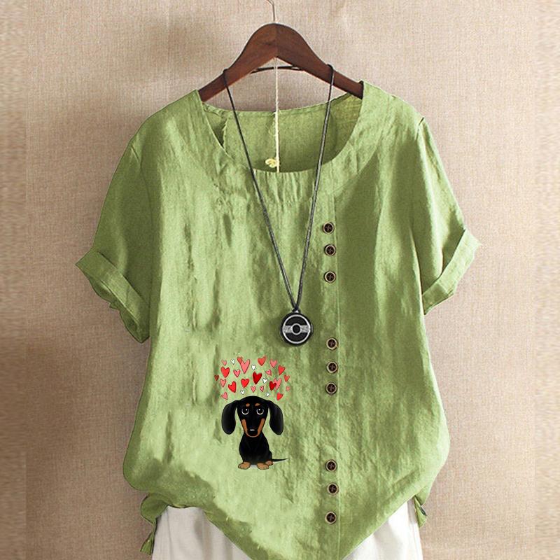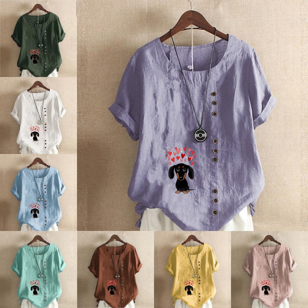 Женская мода Love Dog Printed с круглым вырезом и коротким рукавом футболка повседневная хлопковая льняная рубашка с рисунком для отдыха свободная летняя блузка топы