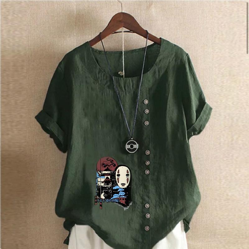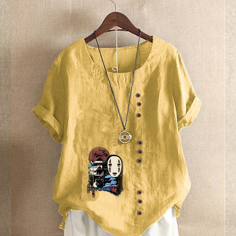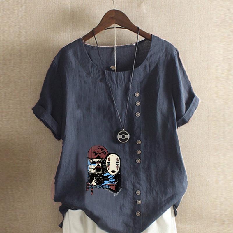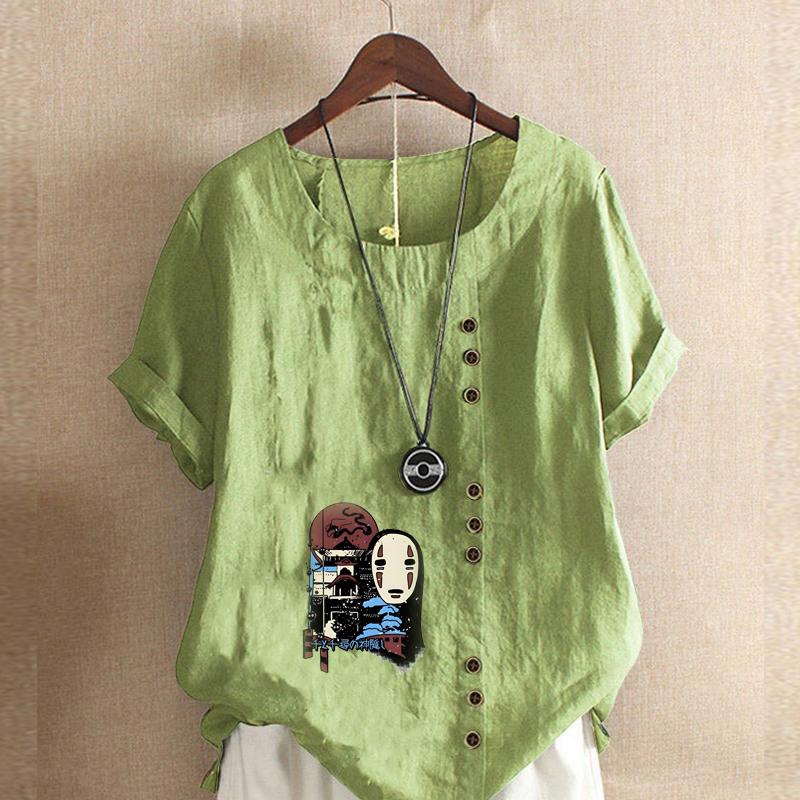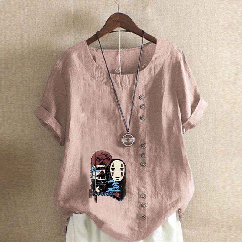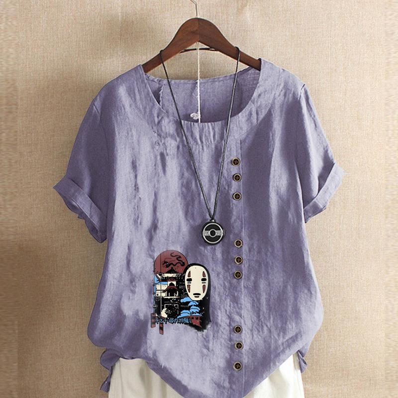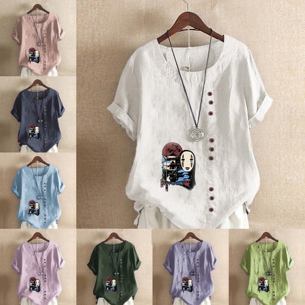 Женская мода, футболка с коротким рукавом и круглым вырезом, повседневная хлопково-льняная рубашка с рисунком, свободная летняя блузка с героями мультфильмов для отдыха, топы
