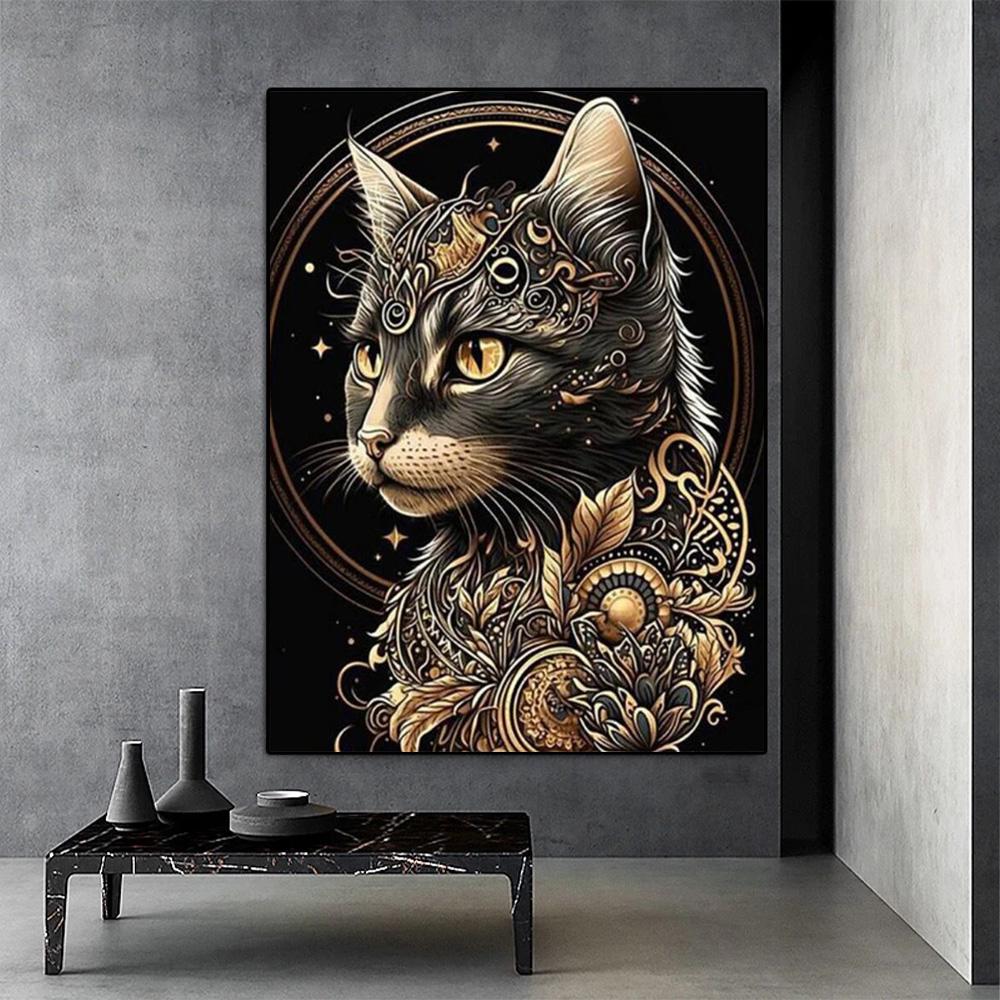 Портретная живопись Черный Золотой Кот Цветы Картина на холсте Животные Постеры Печать Настенная живопись для гостиной Домашний декор Подарок Без рамки