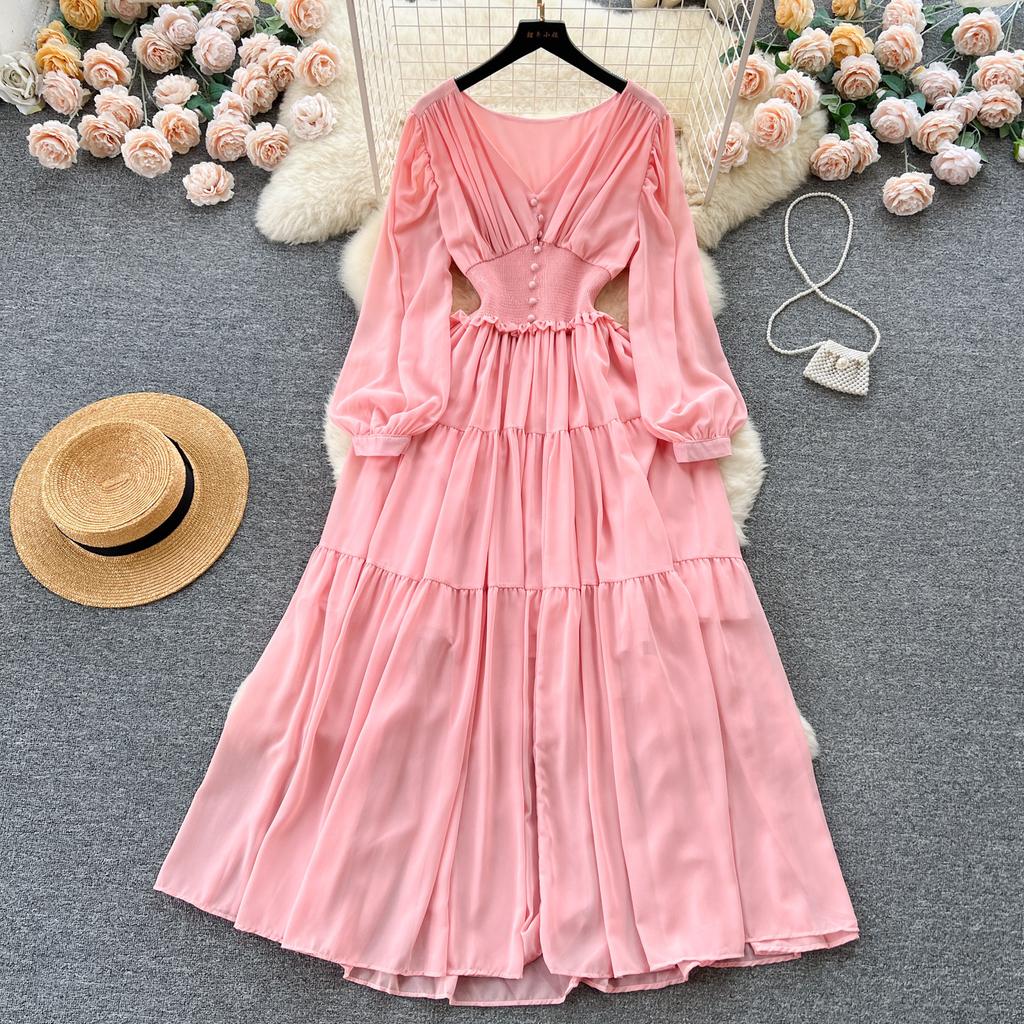 Женское элегантное винтажное шифоновое длинное платье с v-образным вырезом и длинными рукавами, повседневные французские плиссированные тонкие платья трапециевидной формы