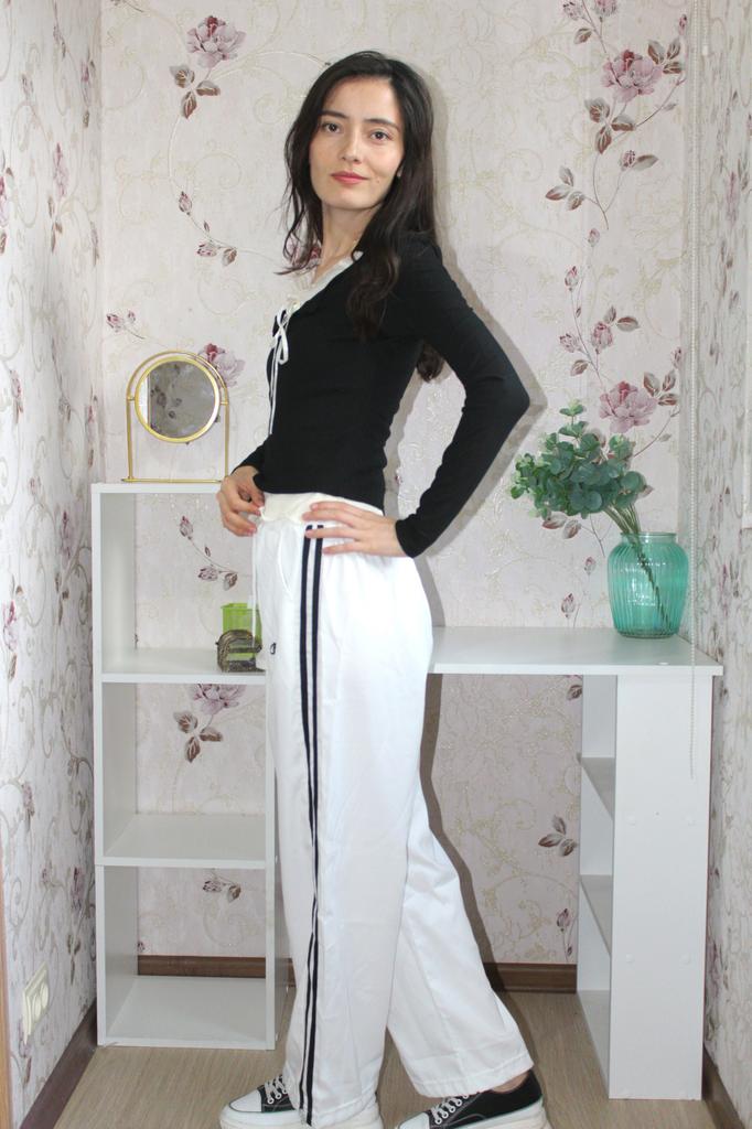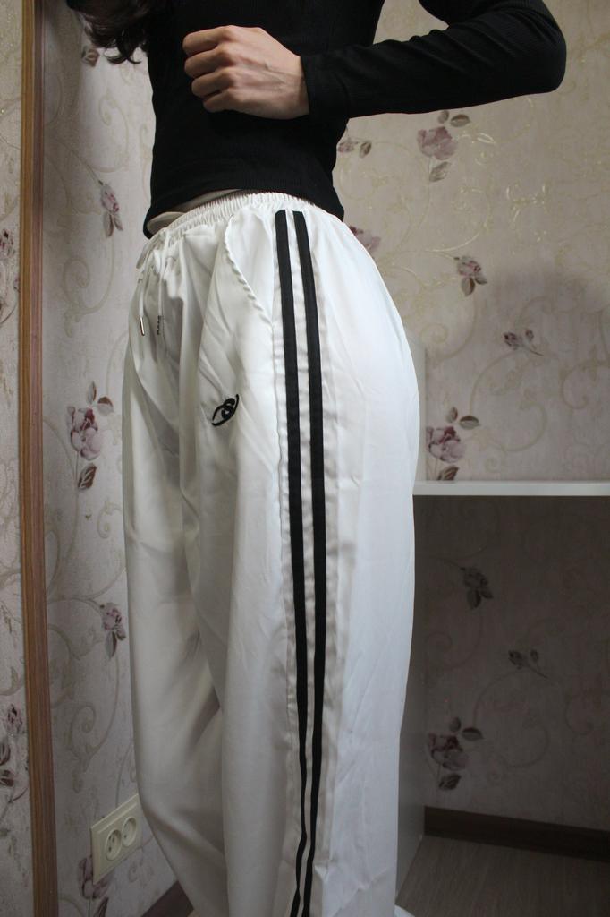Брюки с лампасами 🤍 Брюки свободного кроя с контрастными лампасами 💯 В белом цвете 🤍 Идеальны как для прогулки, так и для дома или комбинирования в лёгких образах.💫 Талия на резинке с завязками. По бокам спереди косые карманы и логотип.✔️ Брючины широкие и прямые. Ткань достаточно плотная, не просвечивает.🌿 Это не тонкая шуршащая синтетика, а напоминает плотный смесовый хлопок. Вблизи как будто с фактурным рисунком. Переживала за размер, но взяла S, ориентируясь на таблицу продавца. Но всё подошло. 👌В брюки заложен лёгкий оверсайз, они сели хорошо на мои параметры: ОТ 61 ОБ 91 Рост 166 см. Если хотите, чтобы сели как на промо фото, лучше взять размер побольше. 🔥Особенно высоким девочкам) Классные брючки, есть также черные 👍