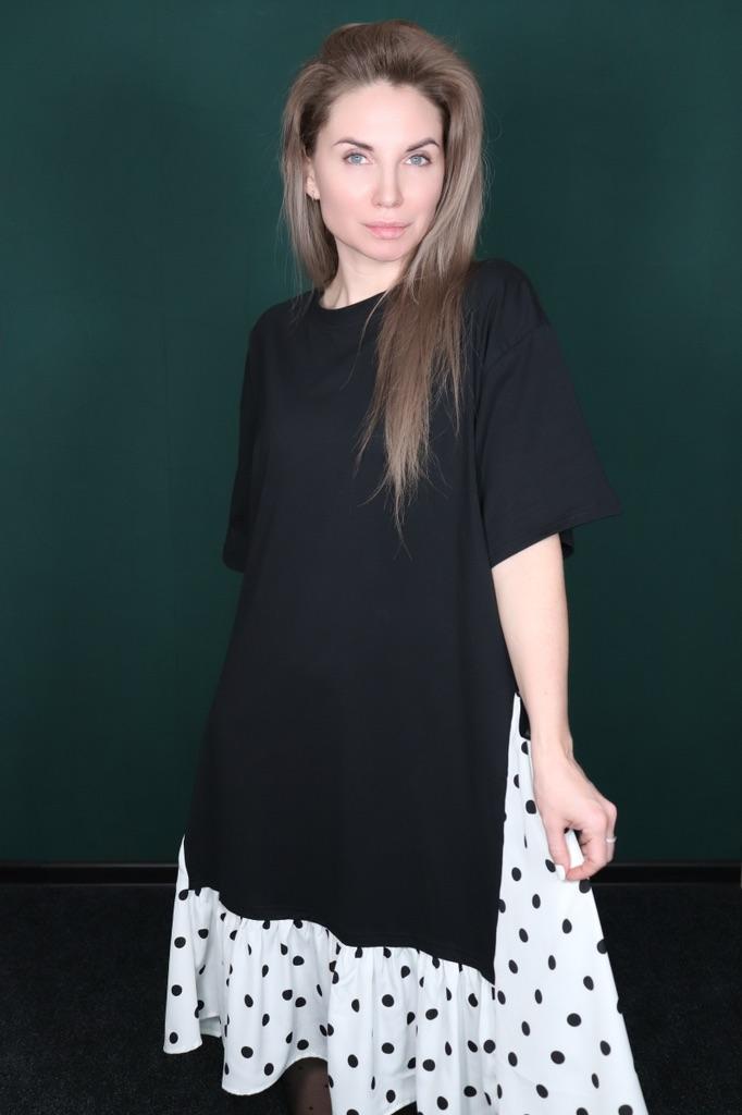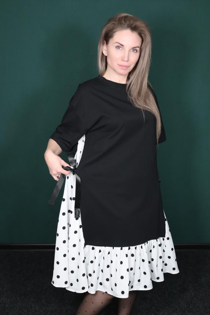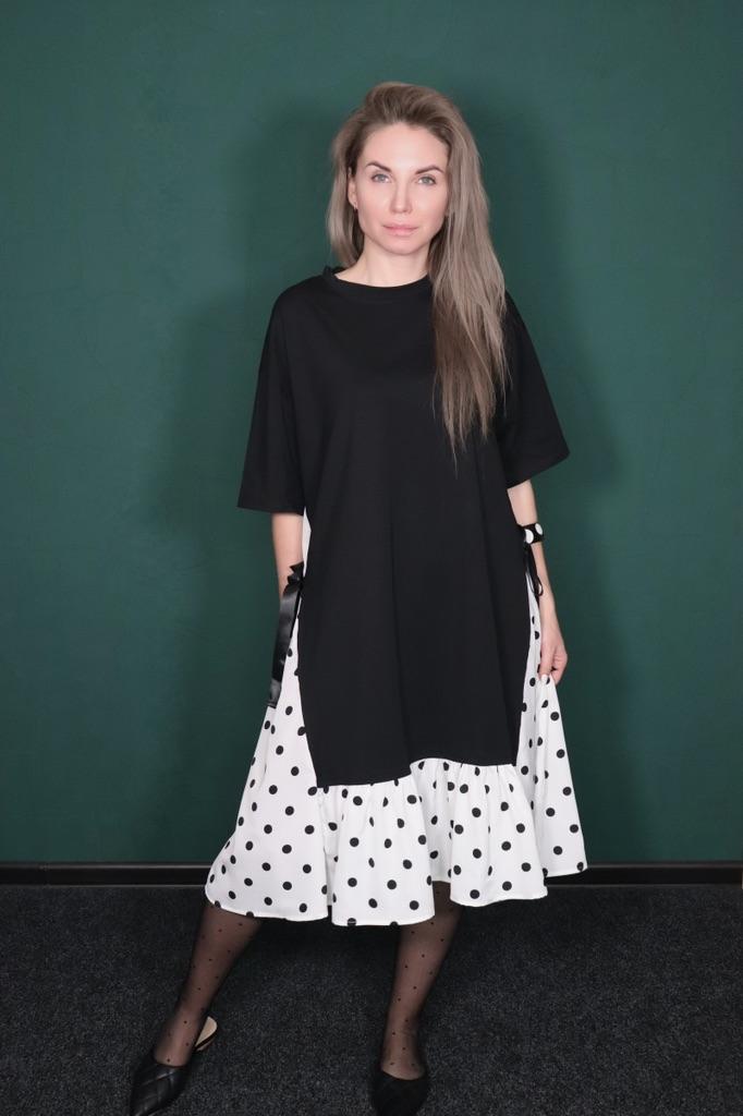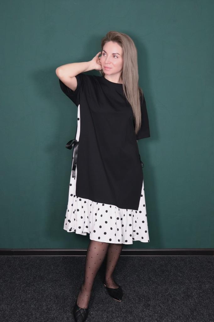 Прелестное платье от Dimanaf Идёт в одном размере, на мне сидит свободно. Ткань эластичная, с большим количеством хлопка, напоминает футболочную. Низ в горошек из лёгкой, летящей ткани. По бокам ленты. 👱🏼♀️ Мои параметры: 📌 Рост -163 см 📌 ОГ -90 см 📌 ОТ -66 см 📌 ОБ -92 см 📌 Плечи -37 см ⭐️⭐️⭐️⭐️⭐️ Очень нравится, рекомендую 👌🏻✨✨✨