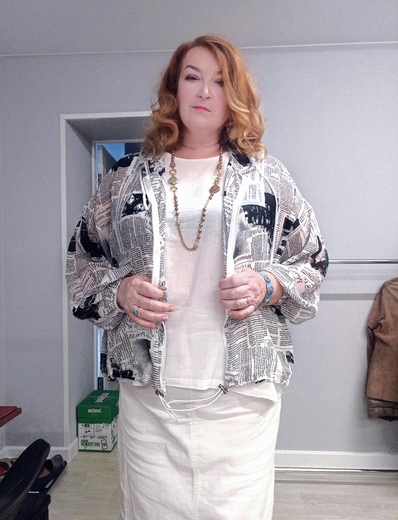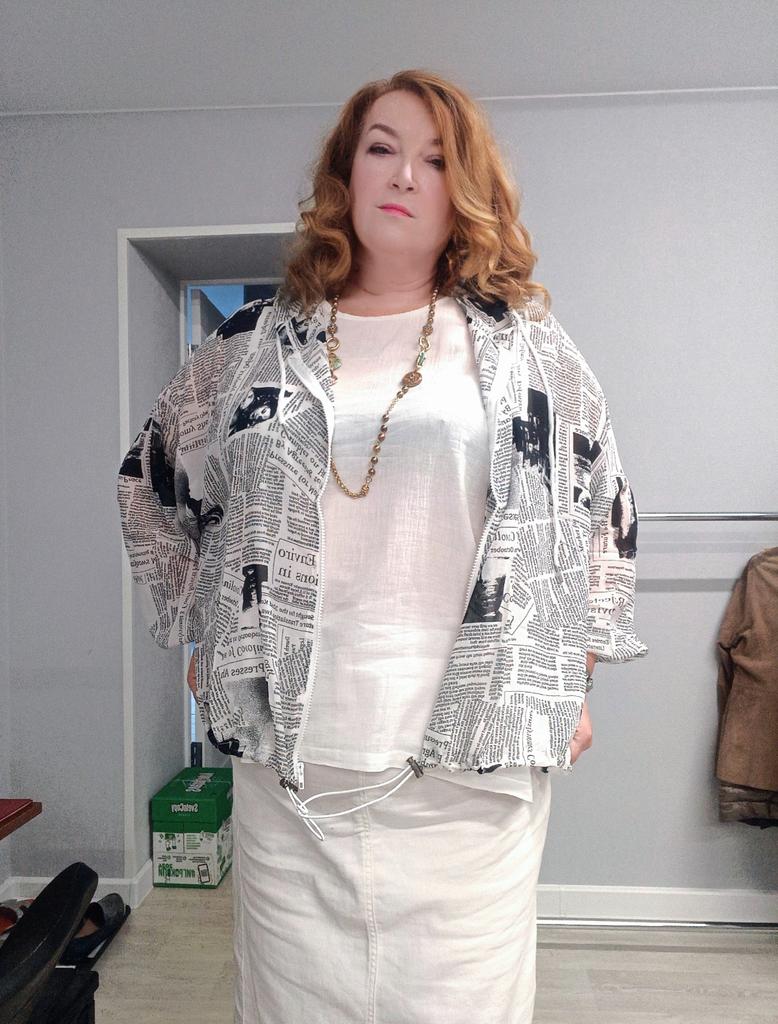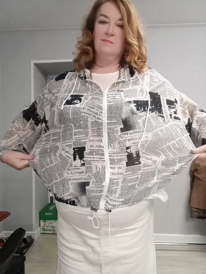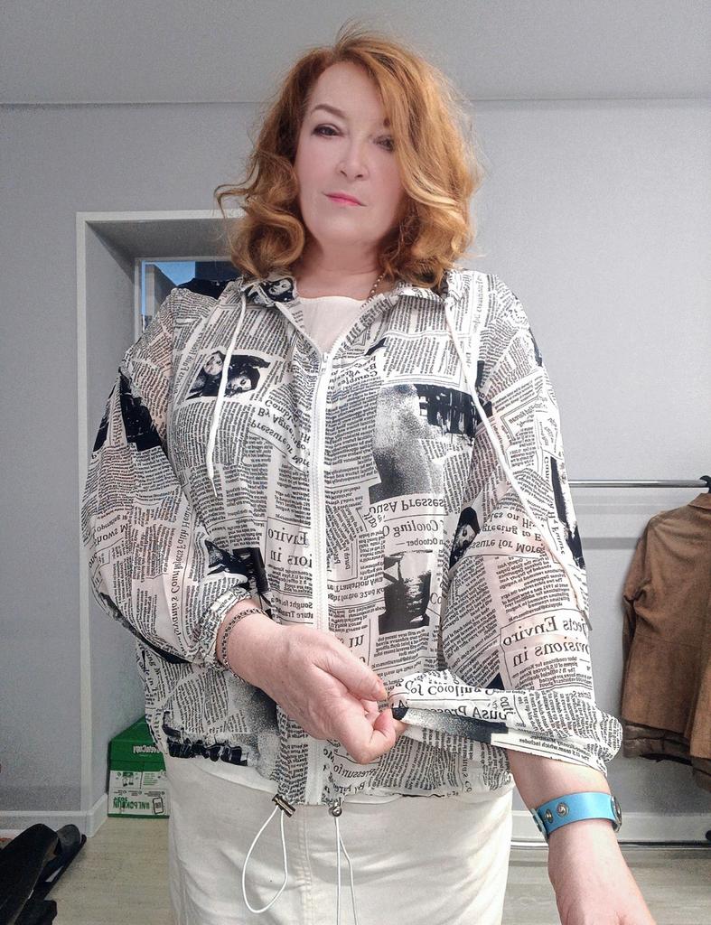 Прелесть, а не ветровка! Сшита из тонкого шифона, с модным газетным принтом. Давно такую искала, и нашла в магазине Диманаф! Такая ветровка защитит от солнца, и места в сумочке практически не займет. К тому же абсолютно не мнется, я ее достала из посылки и надела. Рукава достаточно широкие, можно надеть на объёмную одежду, и подойдёт на полные руки. Низ ветровки и рукавов на резинке. На рукавах она ещё и широкая. А резинка на подоле регулируется с помощью замочков. Капюшон глубокий, его можно затягивать, там есть шнурки.. Молния очень хорошая, застёгивается с первого раза. Размер единый, на мои 120/114/135, рост 178, свободно.
