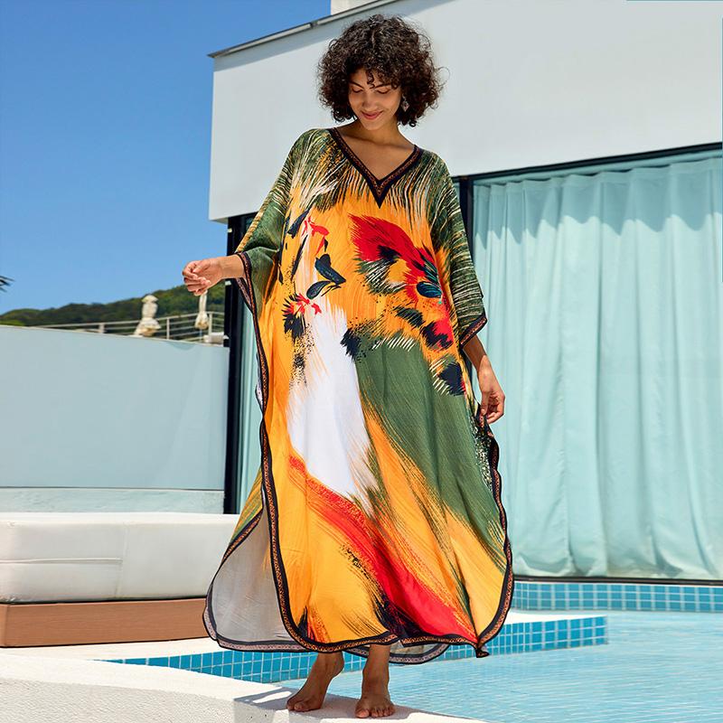 EDOLYNSA Кафтан больших размеров с принтом в стиле бохо, 2024, женский свободный халат с v-образным вырезом и рукавами «летучая мышь», летние каникулы, пляжное платье макси, купальный костюм, накидка