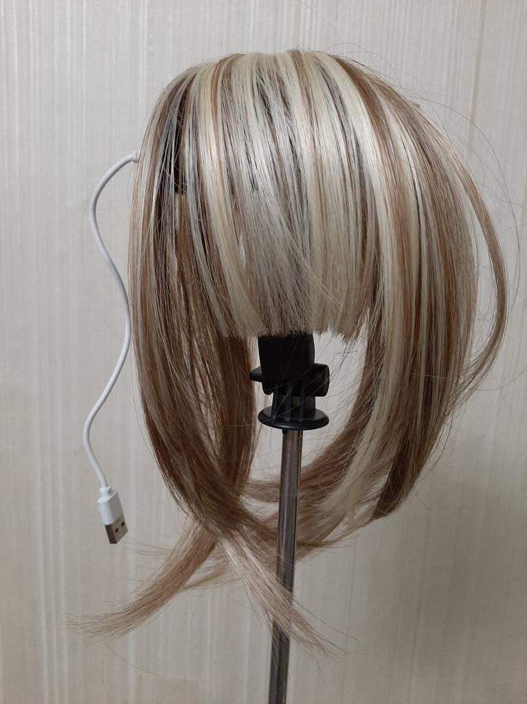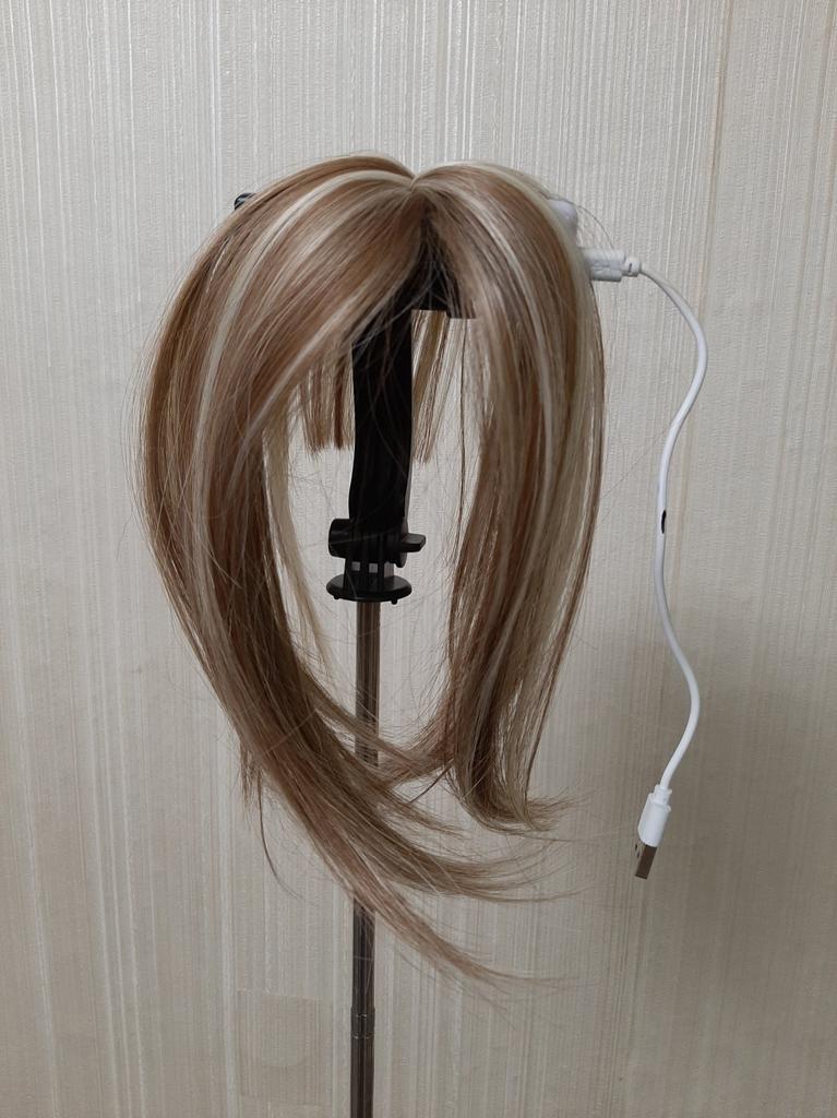 Накладка на голову на прищепках. Волосы мелированные, один цвет совпадает с моим, ещё светлый цвет. Мне бы очень понравилось, нооо, волосы на накладке только с боков впереди и чёлка. Но у меня после химиотерапии на затылке не выросли волосы, лысина. Её я такими накладками и скрываю. Носить невозможно. Когда оставляют отзыв только звёздочки и ни пол слова не пишут. Хочется спросить, а зачем. Ведь важно, какие нюансы у товара, что не видны на фото продавца.