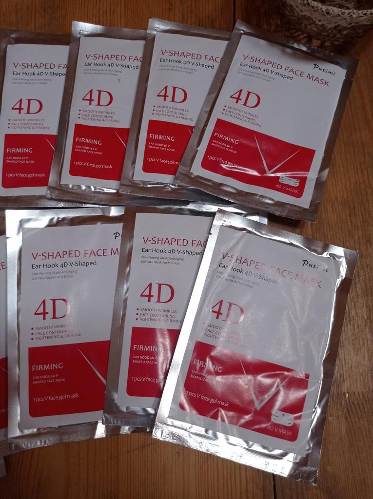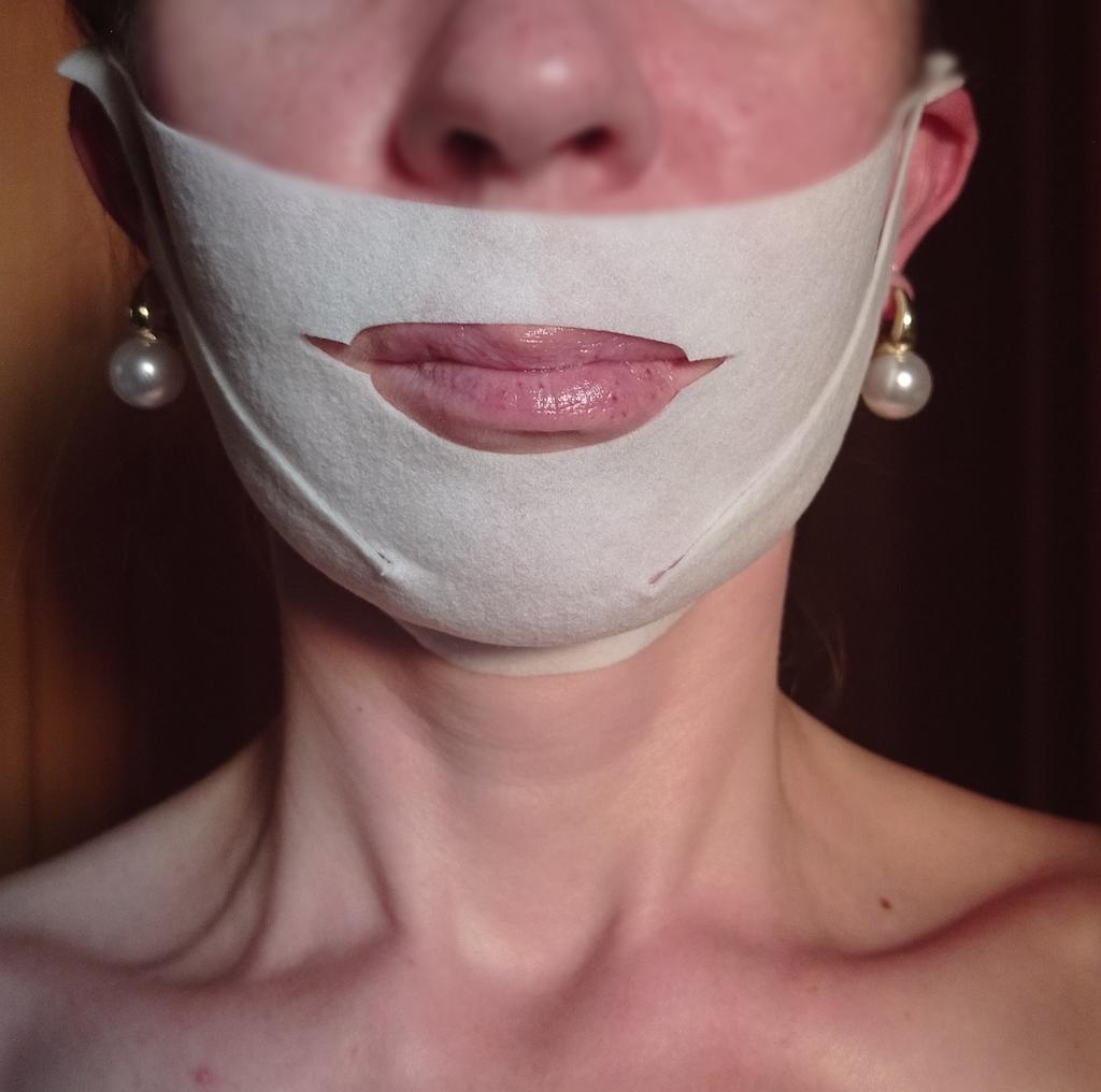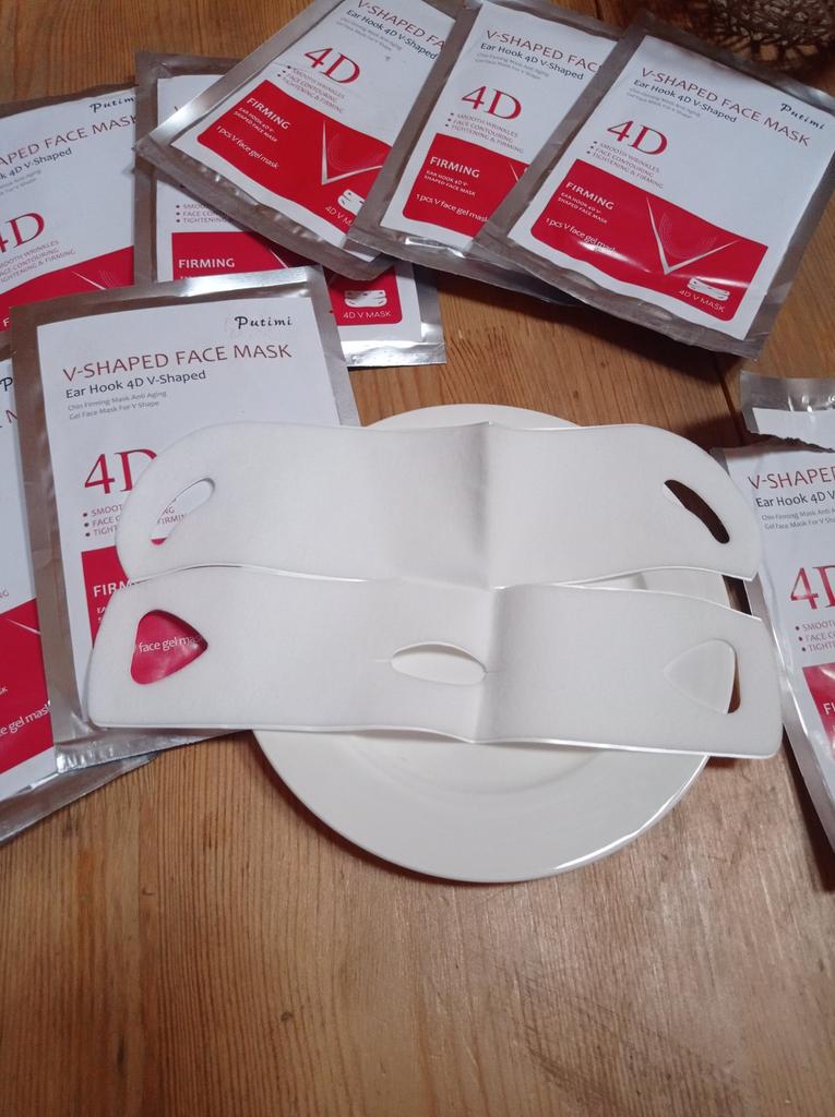Маска от морщин С провезями для ушей и рта. Это не тканевая маска. Внутри какой-то гелевый слой, холодненький. Маска прилипает к коже, одевать ее нужно аккуратно, потихоньку отклеивая защитный слой. Хорошо держится, но ушки устают) Зону подбородка она тоже поддерживает. Подтягивает контур лица, увлажняет кожу. В общем хорошая маска, новая для меня, понравилась. И кожа после нее тоже понравилась. Держать 30-60 минут. Доставка месяц. Товар и продавца рекомендую.