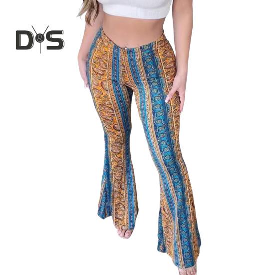 Улучшите свой гардероб с помощью этих модных женских брюк-клеш с принтом.. Создайте модный и повседневный стиль с оттенком ретро.. Этнический принт придает этим брюкам неповторимый шарм. Они изготовлены из слегка эластичной ткани и обеспечивают удобную посадку..