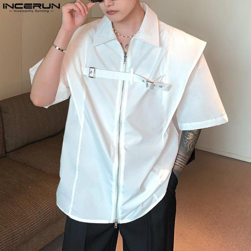 INCERUN Мужские топы с короткими рукавами и оборками, летние рубашки-карго на молнии