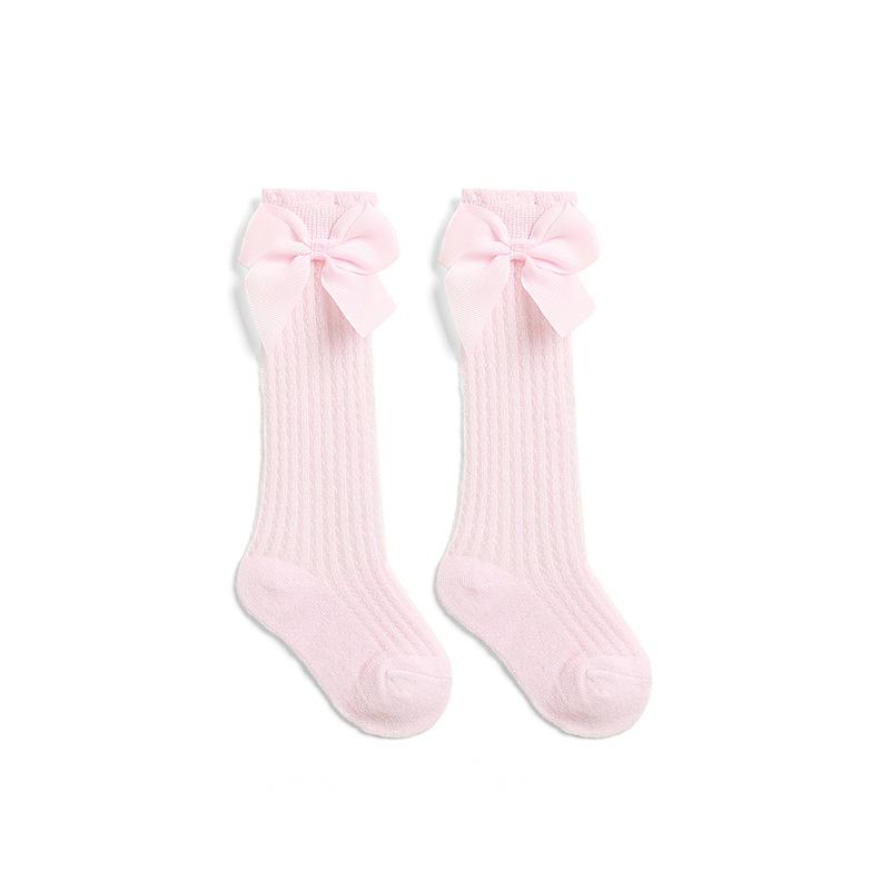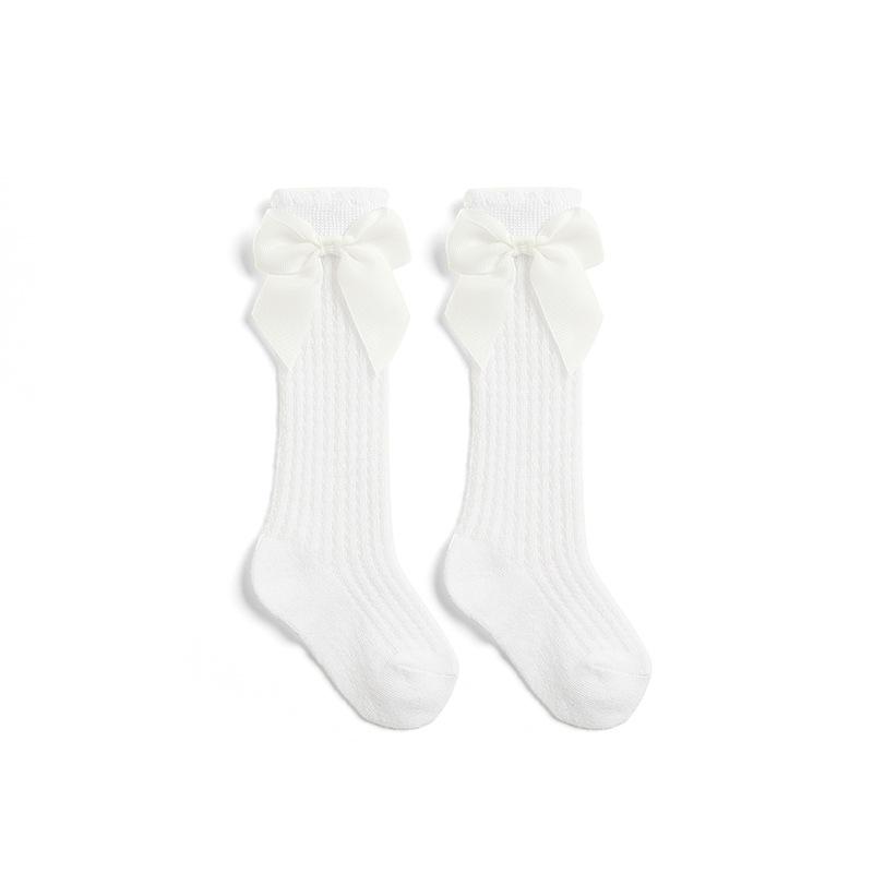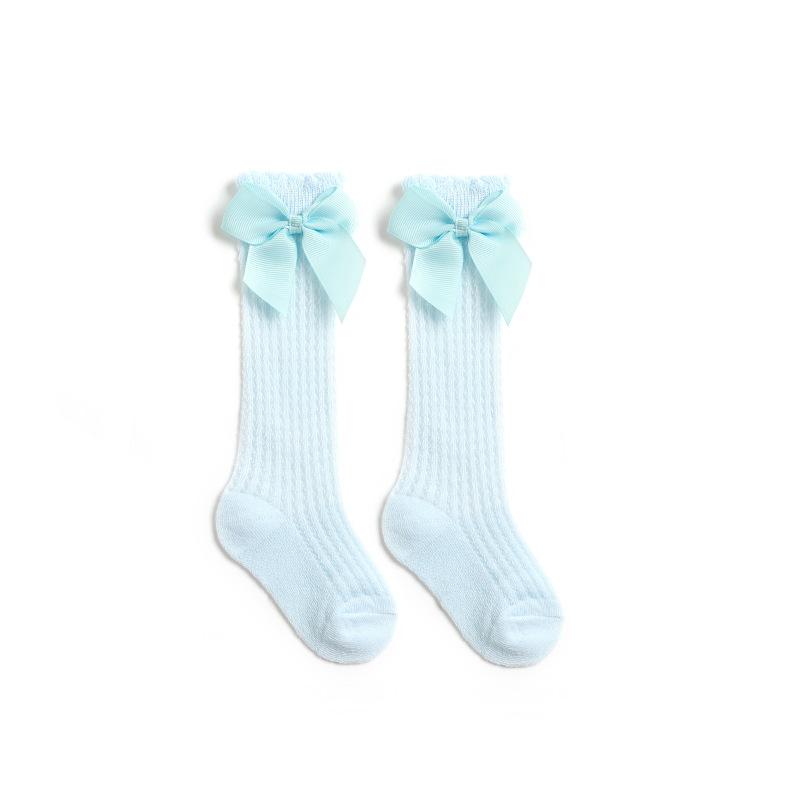 Летние носки для маленьких девочек, милые большие банты, мягкие хлопковые эластичные однотонные сетчатые носки для новорожденных, длинные носки до колена для маленьких девочек