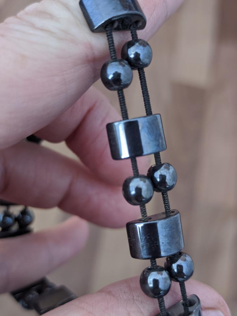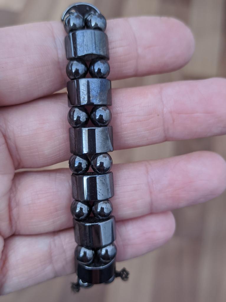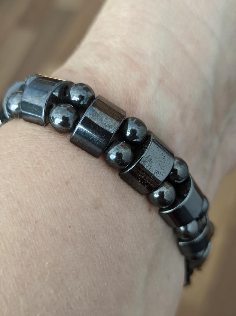 Симпатичный браслет из гематита. Этому распространенному в природе минералу приписывают различные магические и лечебные свойства. Колдуны и шаманы использовали его в своих ритуалах. Считалось, что гематит отгоняет нечистую силу, а также способен разбудить духов. Также люди верят в защитные свойства камня. Из него делают обереги от несчастных случаев, от сглаза. Считается, что камень благотворно воздействует на кровеносную стстему, способен укреплять сосуды и чистить кровь, останавливает кровотечение, снимает воспаление. Гипертоникам его носить не следует, так как гематит может поднимать артериальное давление. На выбор у продавца два варианта браслетов. Я выбрала более широкий. Бусины нанизаны на резинку, застежка не нужна.