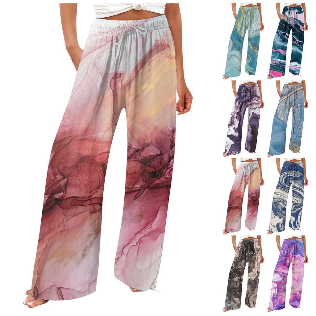 Брюки для женщин. Летние струящиеся брюки с высокой талией и широкими штанинами с принтом. Повседневные брюки. — купить товар онлайн с бесплатной доставкой до всему миру!