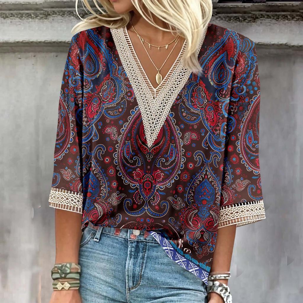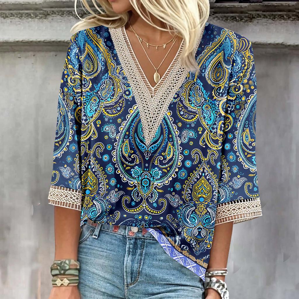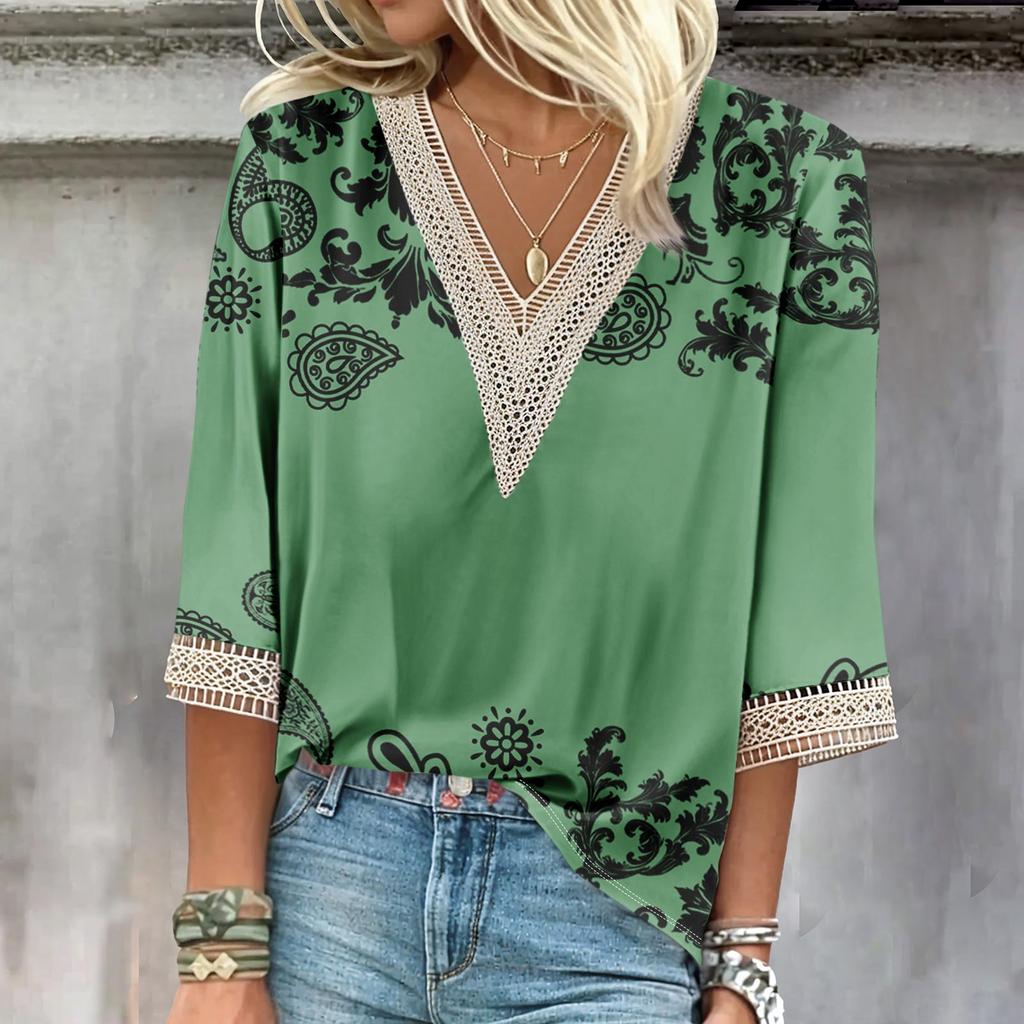 Женская рубашка, блузка, повседневные свободные рубашки, рукава 3/4, кружевные топы с v-образным вырезом и принтом, топы с принтом, футболки, футболки