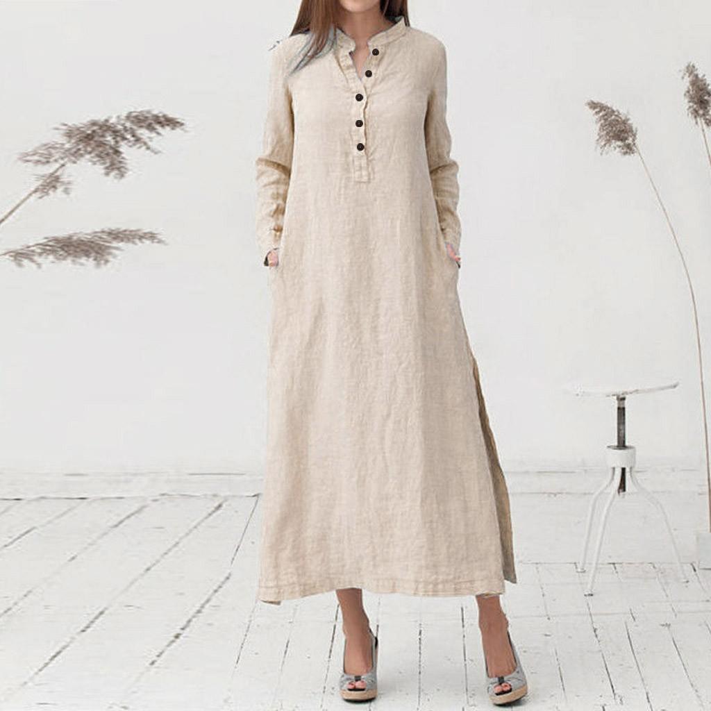 Женское повседневное однотонное свободное платье большого размера из хлопка и льна с длинными рукавами в стиле ретро — купить товар онлайн с бесплатной доставкой до всему миру!