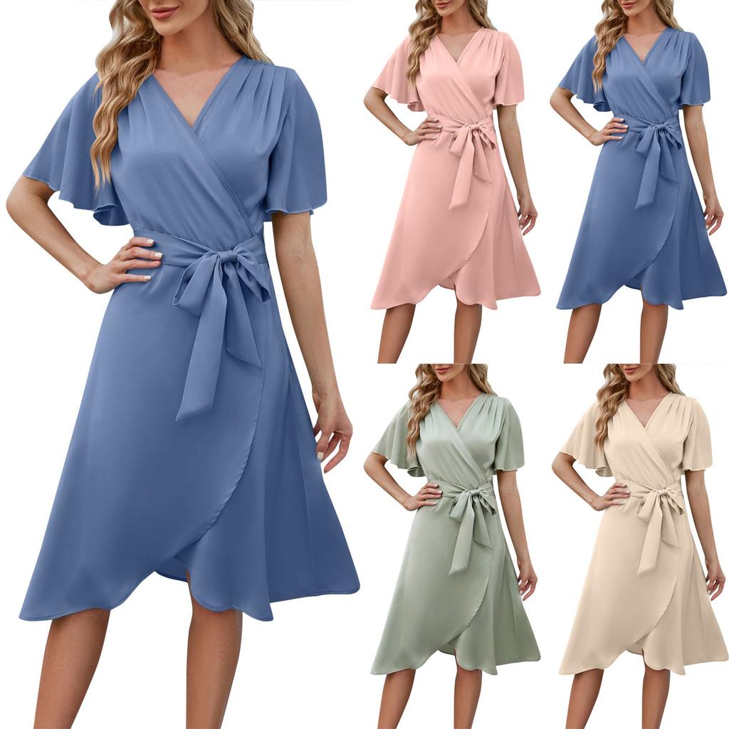 Летнее женское атласное удобное и сексуальное платье с v-образным вырезом и расклешенными рукавами на талии — купить товар онлайн с бесплатной доставкой до всему миру!