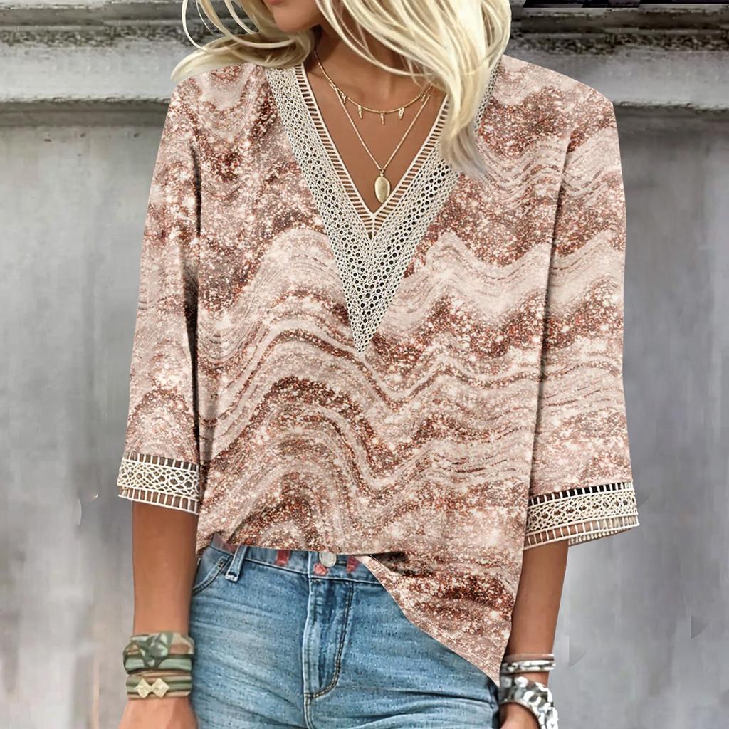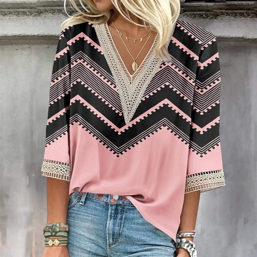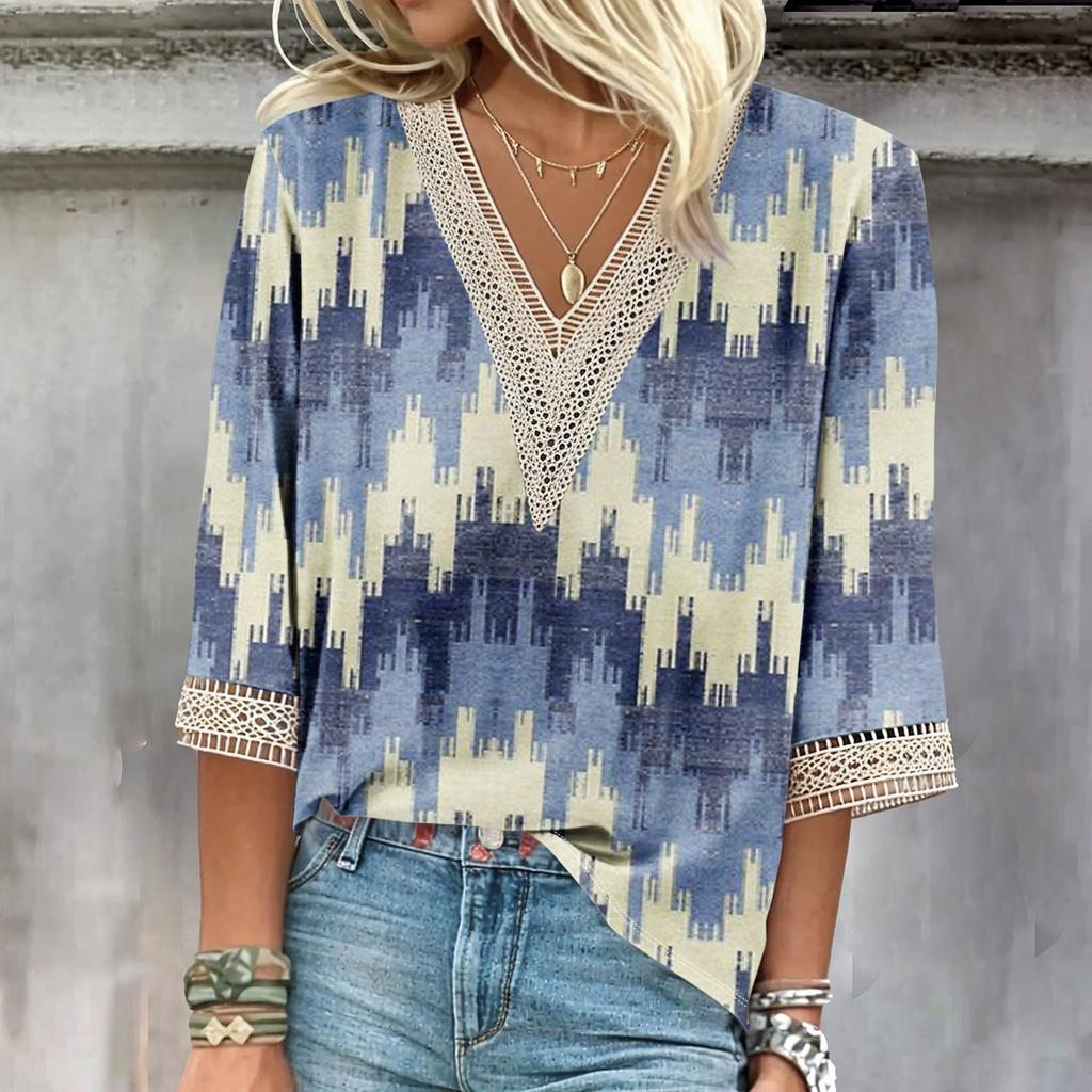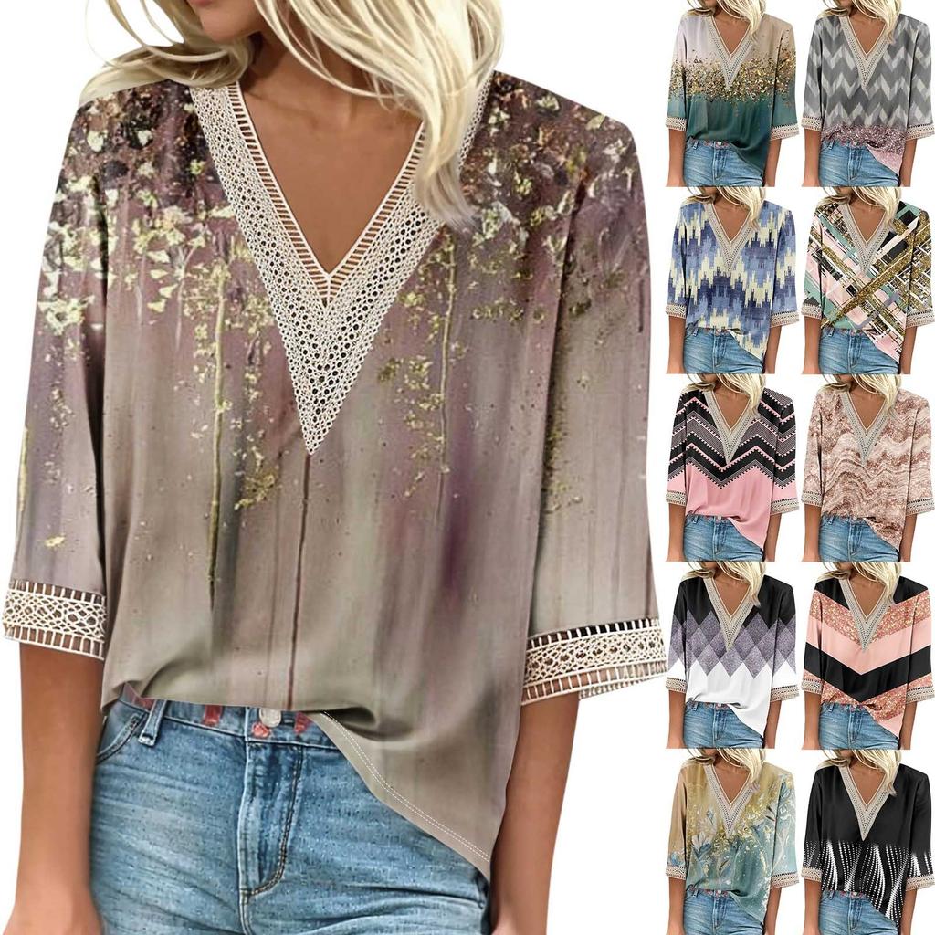 Женские повседневные свободные рубашки с кружевной отделкой и V-образным вырезом Топы с принтом Футболки Футболки