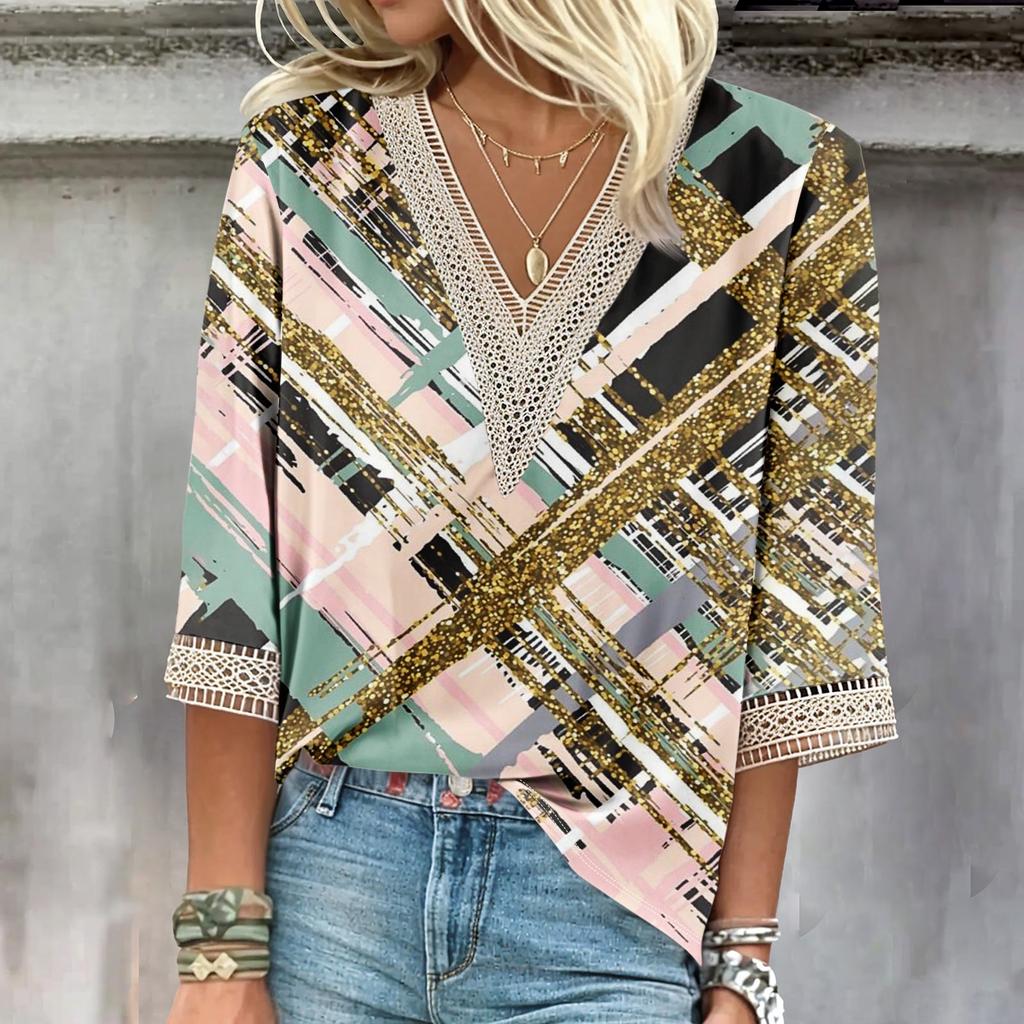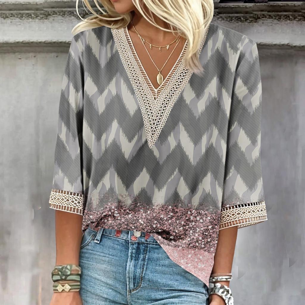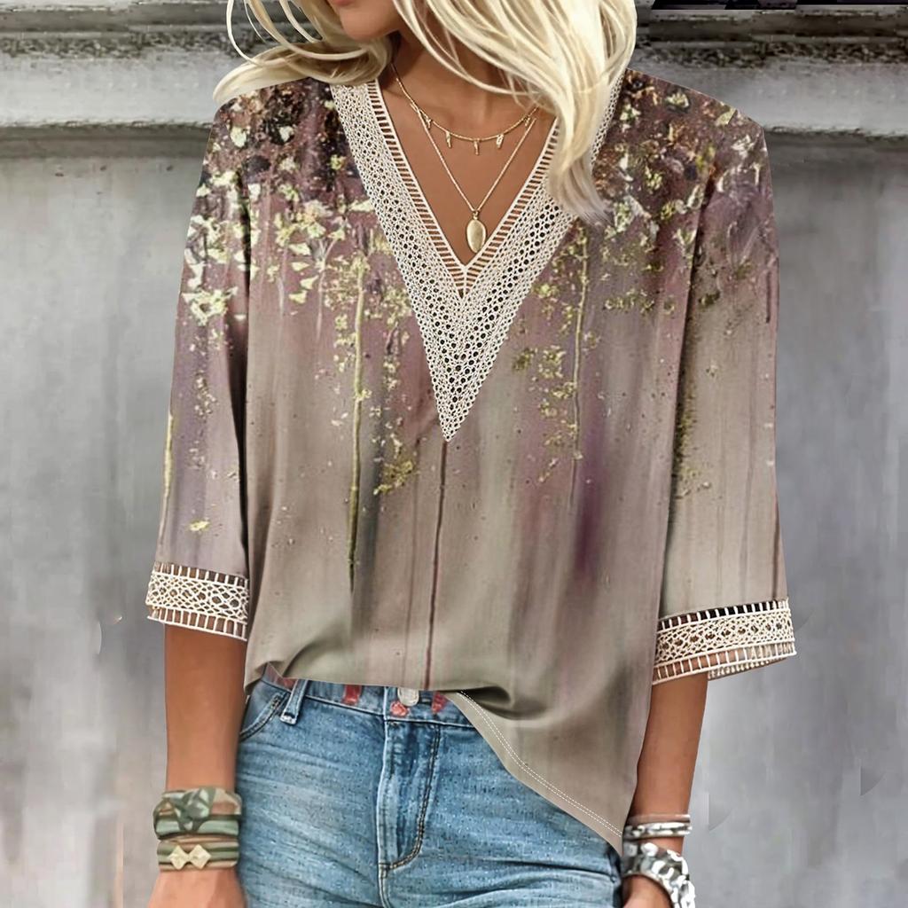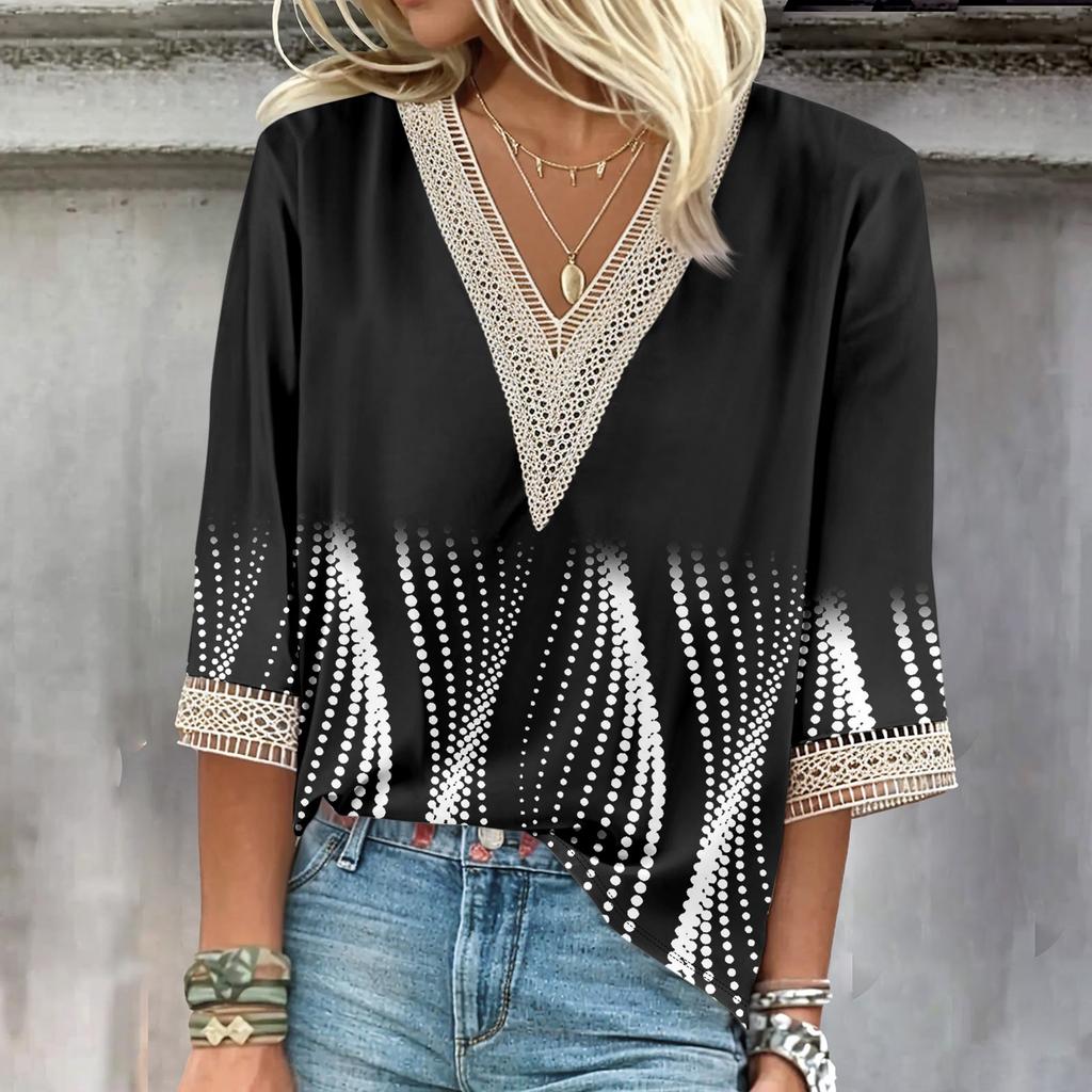 Женские повседневные свободные рубашки с кружевной отделкой и V-образным вырезом Топы с принтом Футболки Футболки