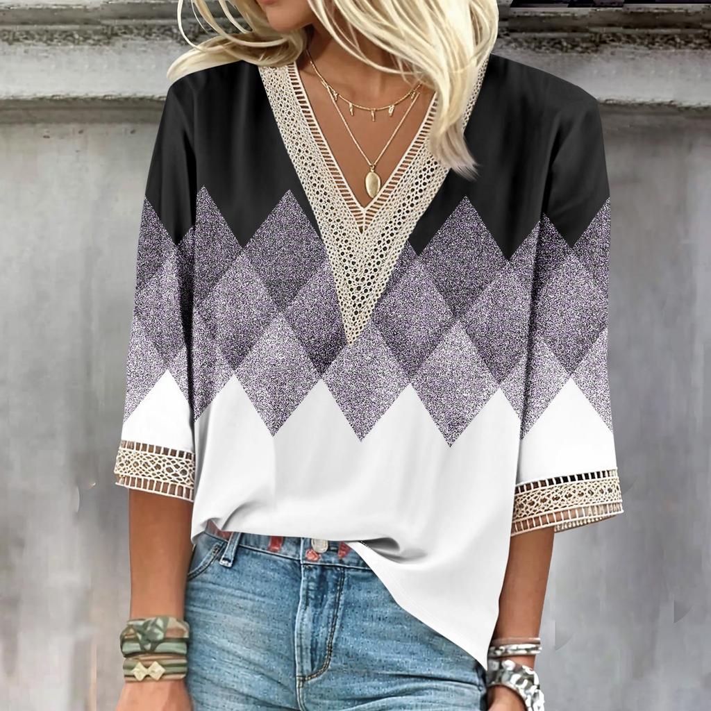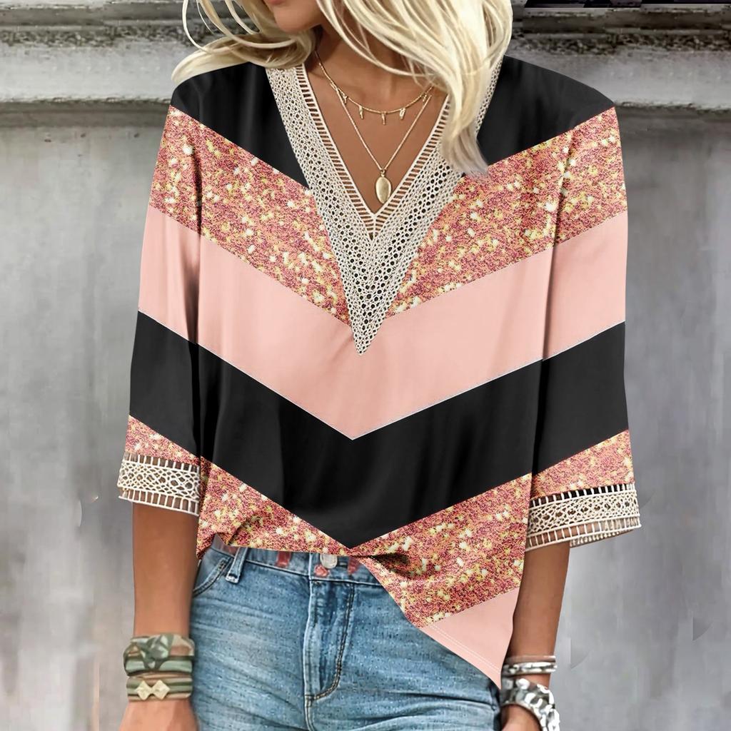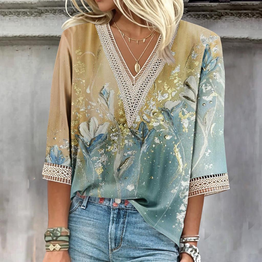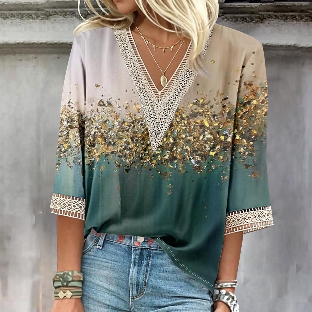 Женские повседневные свободные рубашки с кружевной отделкой и V-образным вырезом Топы с принтом Футболки Футболки