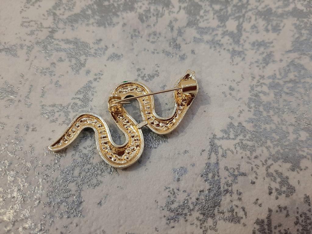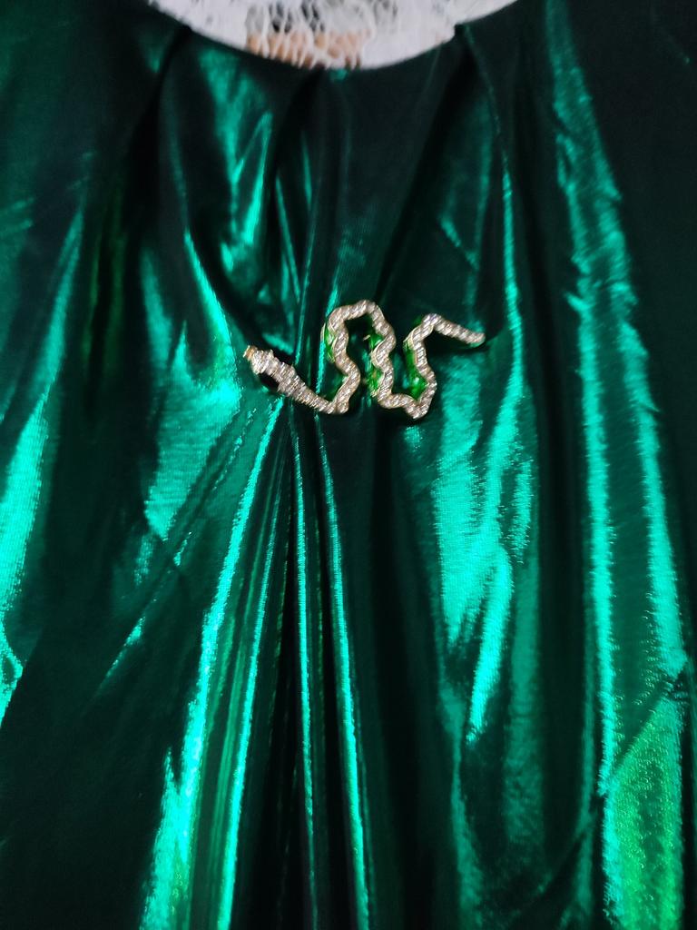 Очень красивая брошь зелёная змея она не очень маленькая достаточно приличный размер я её использовала во время новогодней вечеринки дома надев шикарное зелёное платье в честь года зелёной змеи и прицепив её сверху платье как украшение мне кажется вышло красиво