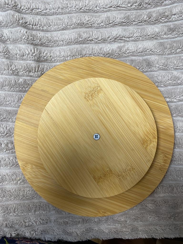 Очень маленькая подставка из клеенных досок. Диаметр 20 снаружи, внутренний 17. Нет никаких ножек противоскользящих. Центр смещен, поэтому крутится со смещением. Присутствует трещина, думаю после мытья развалится.
