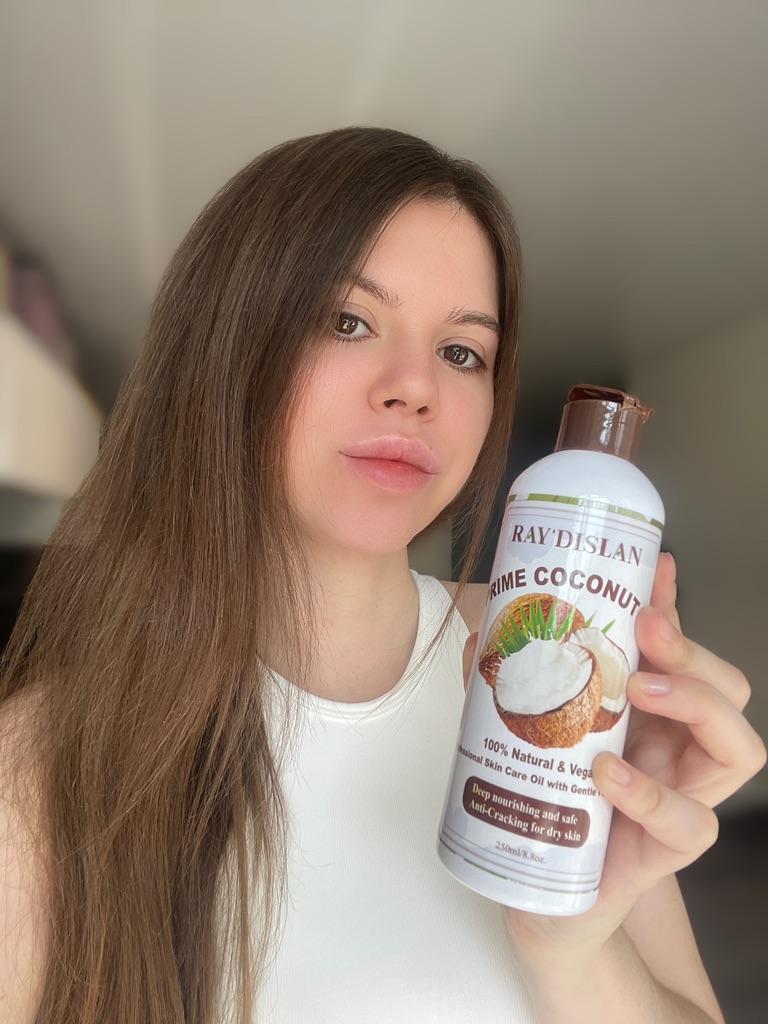 КОКОСОВОЕ МАСЛО🥥 Универсальное уходовое средство! Привет. Сегодня поговорим о маслах. В данном случае о кокосовом, но в составе много других полезных компонентов. Об этом позже. Итак, продукт из Китая. Пластиковая бутылочка. Объем 250мл. Основной заявленный компонент - кокосовое масло. Очень много пользы для кожи и волос. И тут подробнее остановимся. 🥥Кокосовое масло - это универсальное и многофункциональное средство красоты, которое можно использовать как для ухода за волосами, так и для увлажнения и питания кожи тела. 🌿Кокосовое масло помогает бороться с такими проблемами волос, как повреждения, ломкость, сухость и тусклость. Оно увлажняет и смягчает волосы, делая их шелковистыми и блестящими. Кроме того, масло способствует росту волос и предотвращает их выпадение. 🌿Для волос кокосовое масло является истинным спасением. Оно богато питательными веществами, такими как жирные кислоты и витамины, которые питают и укрепляют волосы. Масло обладает способностью глубоко проникать в волосы, заполняя их внутреннюю структуру и восстанавливая ее. 🥥Кокосовое масло также имеет преимущества для кожи тела. Оно отлично увлажняет и смягчает сухую кожу, предотвращает появление шелушений и пересушенности. Масло обладает антиоксидантными свойствами, которые помогают бороться с воздействием свободных радикалов и предотвращают преждевременное старение кожи. 🌿Для использования на теле, кокосовое масло можно наносить на кожу после душа или ванны и массировать до полного впитывания. Оно также может быть использовано в качестве основы для натуральных скрабов или в качестве ингредиента в домашних косметических рецептах. Пришло масло в коробке. Флакон запечатан в пленку. Внутри жидкое масло. Запах нейтральный, кокос - одна из ноток. Под основным колпаком есть защитный,помогает не пролиться. Увлажняет отлично! Смывается сложно, как и положено маслам. Но состав намного шире, помимо того, что нарисовано на коробке. Состав: ✓масло кокоса ✓экстракт алоэ ✓экстракт лаванды ✓экстракт авокадо ✓экстракт зародышей пшеницы ✓фруктовое масло. Однозначно полезный продукт по уходу за кожей и волосами. У меня раньше была баночка масла кокоса, там скорее кремообразная форма, густая была. Очень нравился эффект. Тут совсем жидкое масло, но суть та же. Нравится ✅ #elena_likui #кокосовое_масло #Ray_Dislan