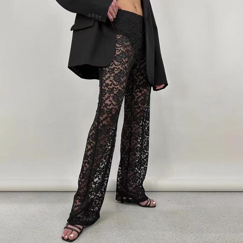 Сексуальные женские прозрачные кружевные брюки, прозрачные готические брюки с высокой талией, широкие брюки-клеш, женские брюки-клеш, клубная уличная одежда