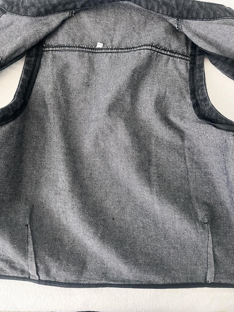 Жилет идет в размер. Ткань плотная. Не джинс. Цвет черно-серый с потертостями и белыми вкраплениями. Большие вырезы под руками. Большие рукава. Не могу сказать, что плохая, но представляла себе более мягкую ткань.