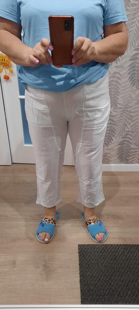 Штаны - лен,лёгкие, идут в размер,даже можно на один размер брать больше,кто любит по свободнее. По длине оказались капри- ниже колена. Просвечивают-если для кого то это принципиально. Пошив - качественный