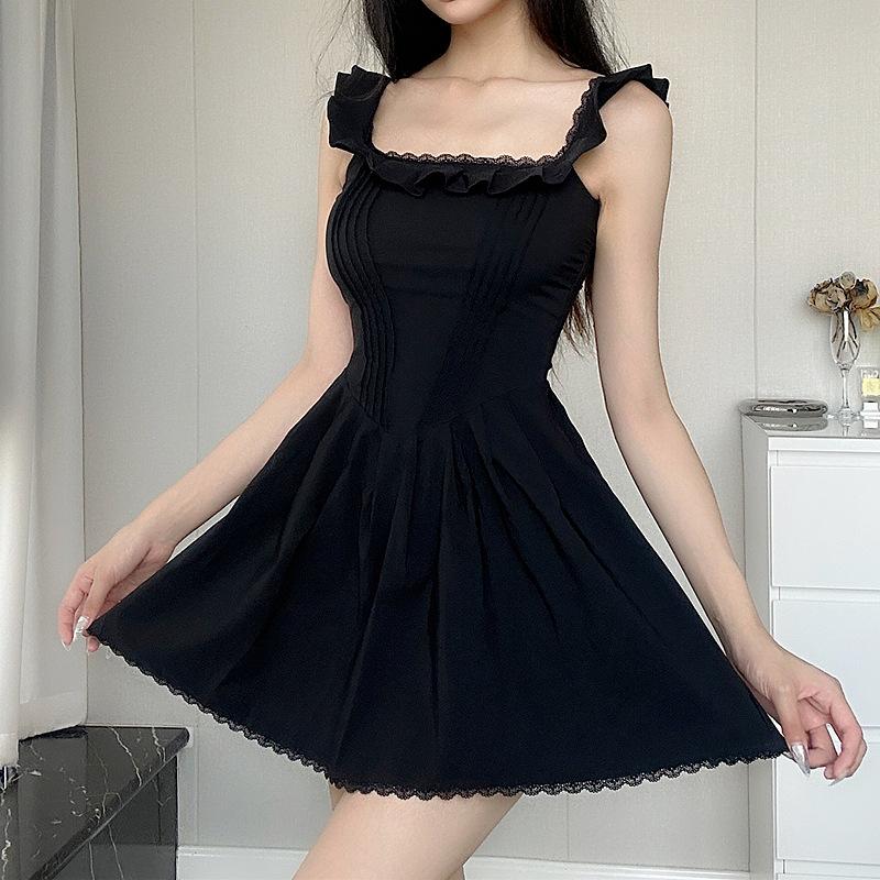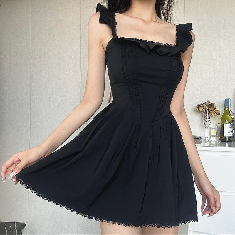 Черное платье, женское элегантное винтажное мини-платье с пышными рукавами и квадратным воротником, маленькая черная юбка для девочек, женская летняя одежда