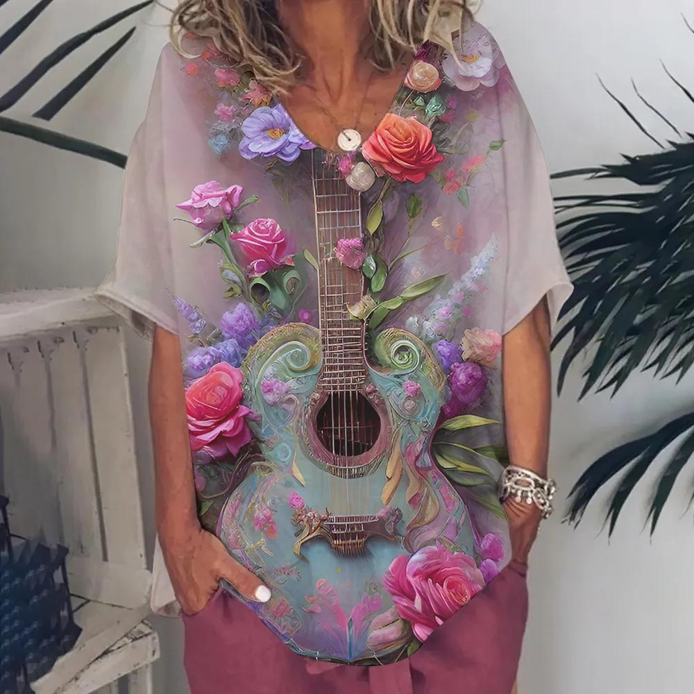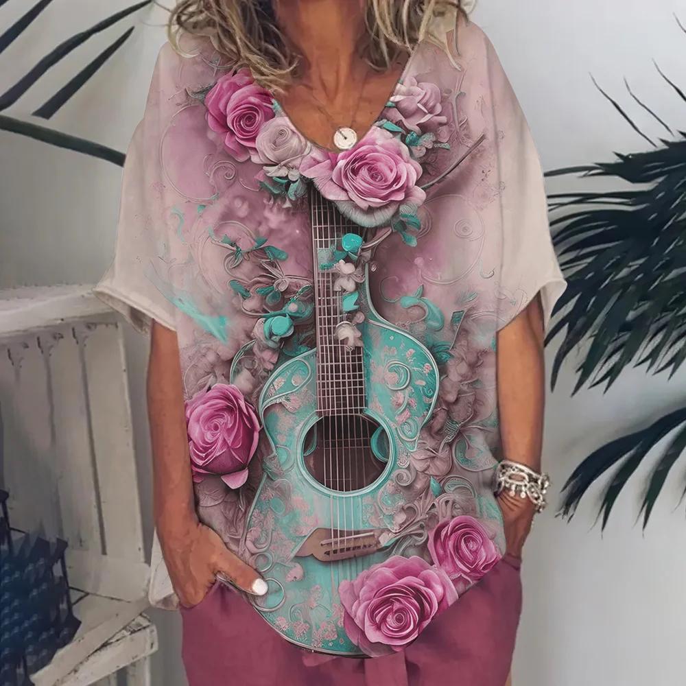 Женская одежда с v-образным вырезом, женская одежда больших размеров с коротким рукавом, летняя футболка в стиле ретро, модная футболка с принтом скрипки, уличная одежда