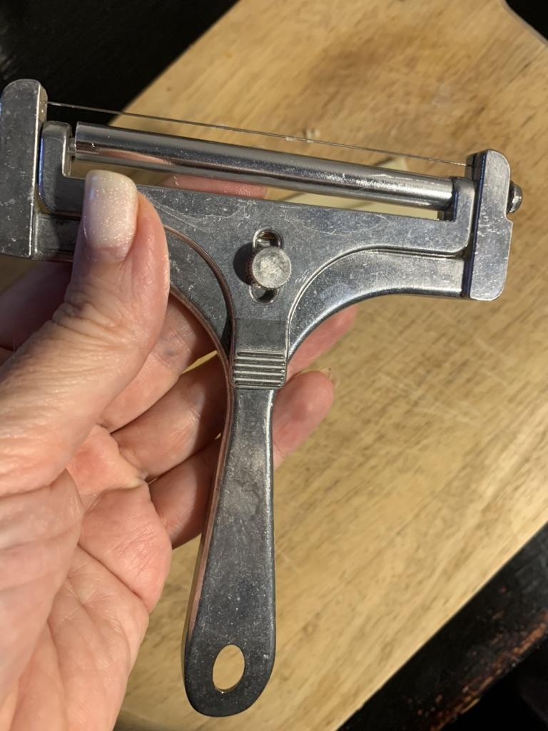 Резак для сыра Удивительно, но это совершенно рабочая вещь оказалась. Сыр режем тонко и без проблем У меня типа Чеддер В таком обычный нож всегда «вязнет» Здесь нарезает мигом Толщина ломтей регулируется винтом посредине И вообще вещь не маленькая, как видите Нержавейка Могу советовать