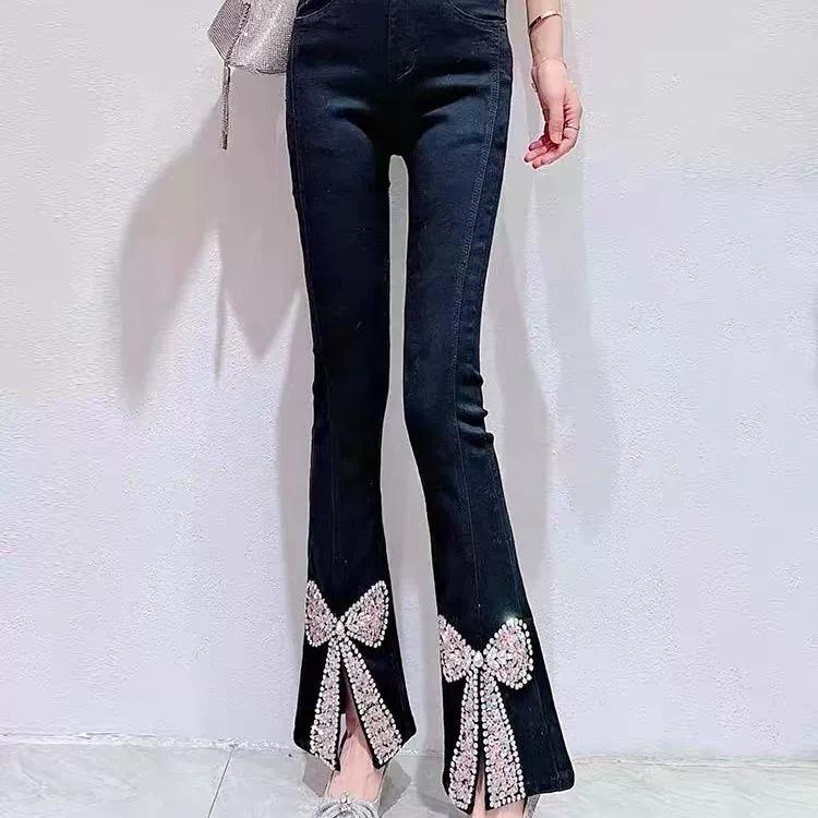 Джинсы-клеш с разрезом, отделанные кристаллами, стразами и бриллиантами, женские, слегка расклешенные, с высокой талией, большие размеры 3XL — купить товар онлайн с бесплатной доставкой до всему миру!