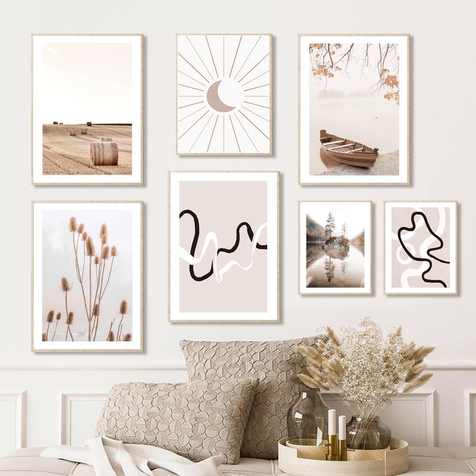 Бежевый Озерная Ферма Лодка Одуванчик Бохо Абстрактные Линии Плакаты И Принты Холст Искусство Настенное Украшение Дома Картины Для Гостиной