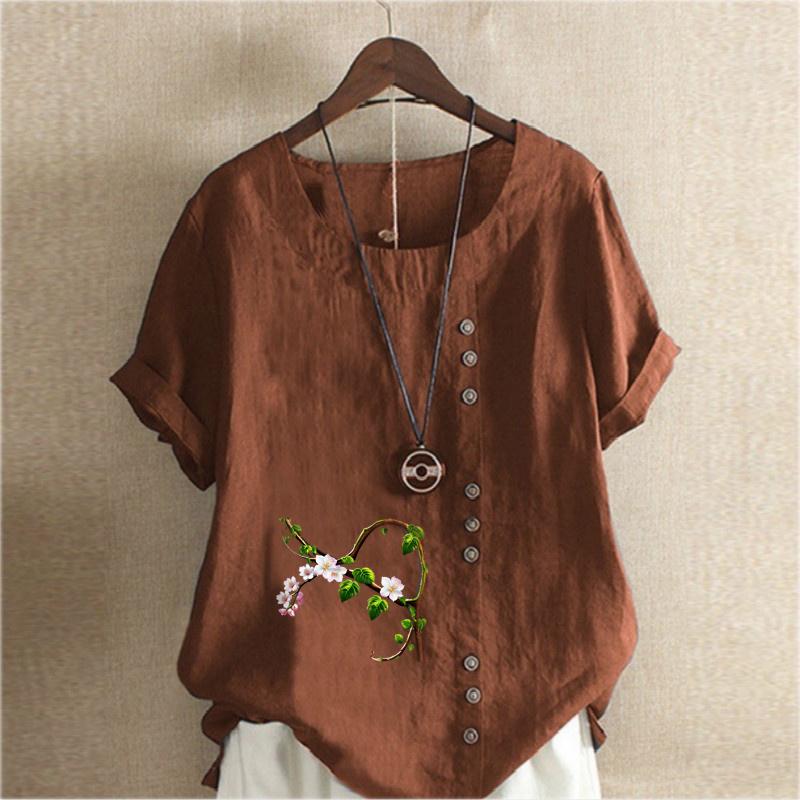 Женская модная футболка с круглым вырезом и коротким рукавом, повседневная рубашка из хлопка и льна с рисунком, свободная летняя блузка с цветочным принтом, топы
