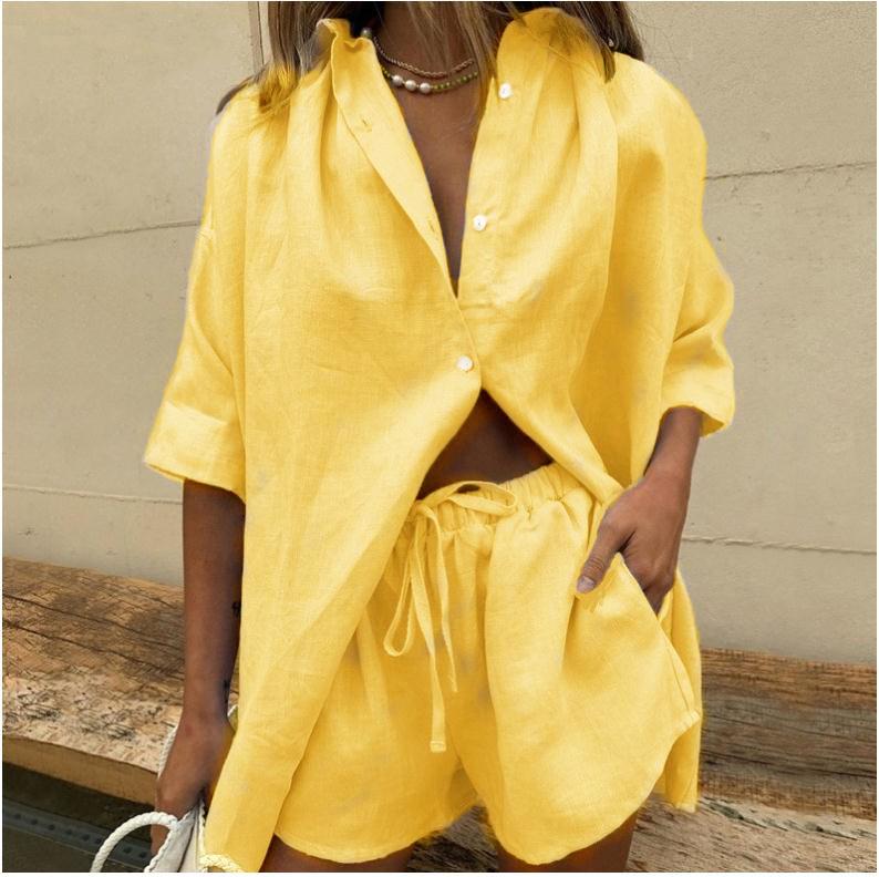 Повседневные комплекты с шортами, хлопковые комплекты из двух предметов, уютная рубашка с лацканами и рукавами-фонариками, летний наряд, шорты с эластичной резинкой на талии, костюмы
