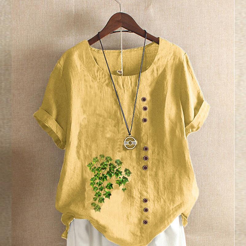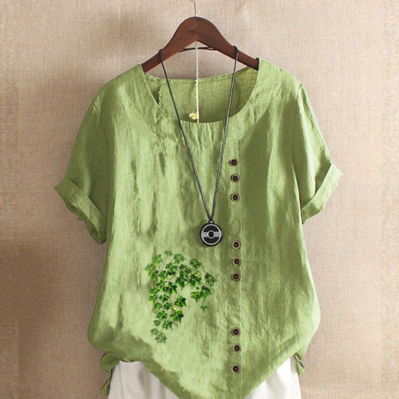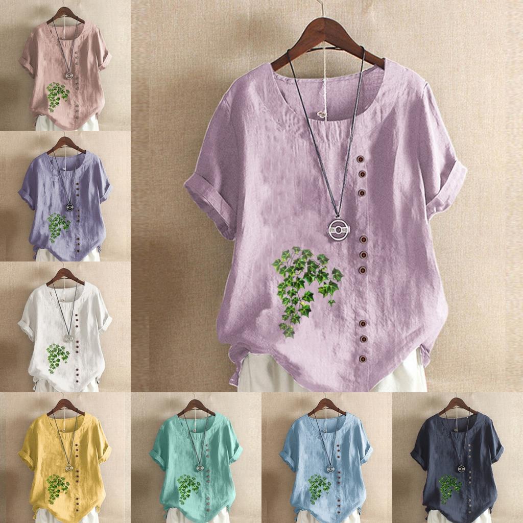 Женская модная футболка с круглым вырезом и коротким рукавом, повседневная рубашка из хлопка и льна с рисунком, свободная летняя блузка с принтом зеленых растений, топы