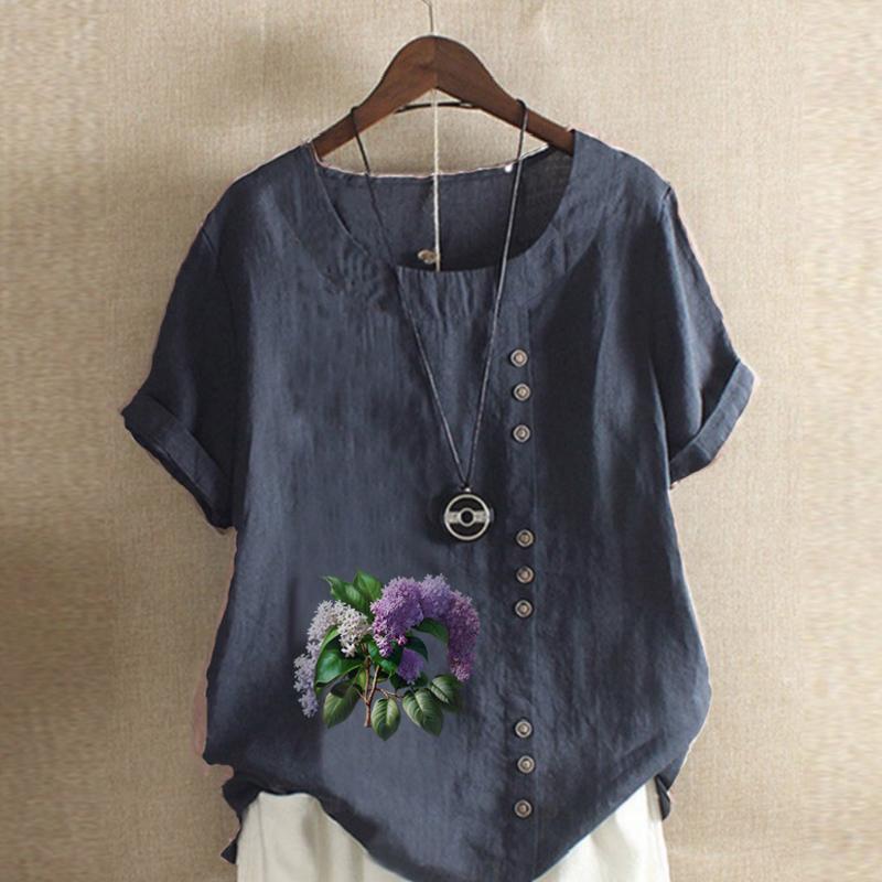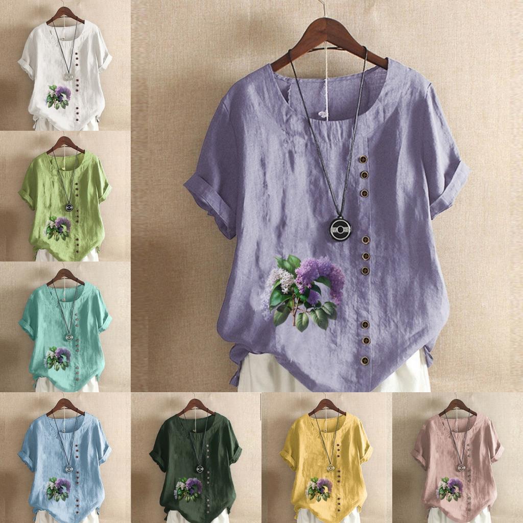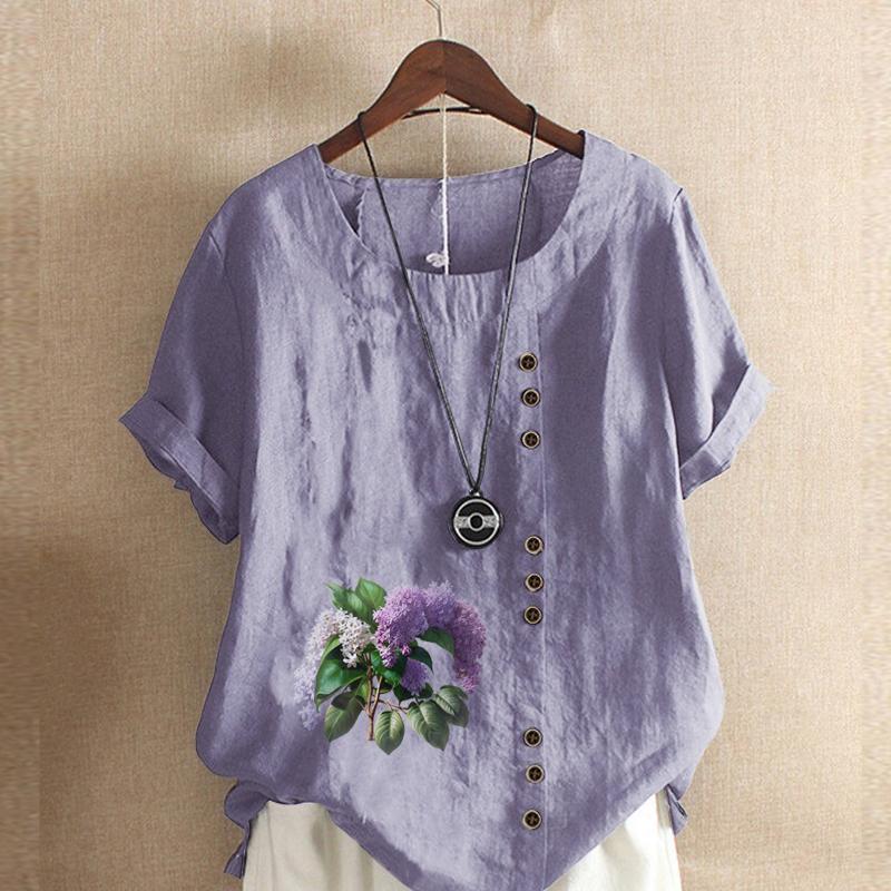 Женская модная лавандовая футболка с круглым вырезом и коротким рукавом, повседневная хлопковая льняная рубашка с рисунком, свободная летняя блузка, топы
