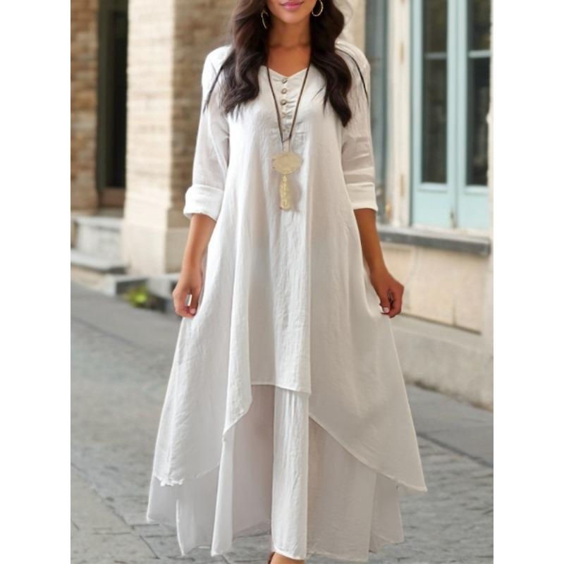 Винтажное летнее бохо миди платье женское элегантное однотонное многослойное платье с длинным рукавом модное свободное повседневное платье с V-образным вырезом Vestidos — купить товар онлайн с бесплатной доставкой по всему миру!