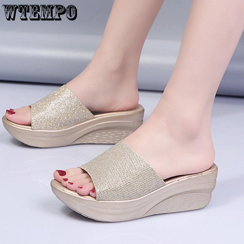Женские тапочки с блестками, летние римские туфли на толстой подошве, танкетка, односложные женские сандалии и тапочки
