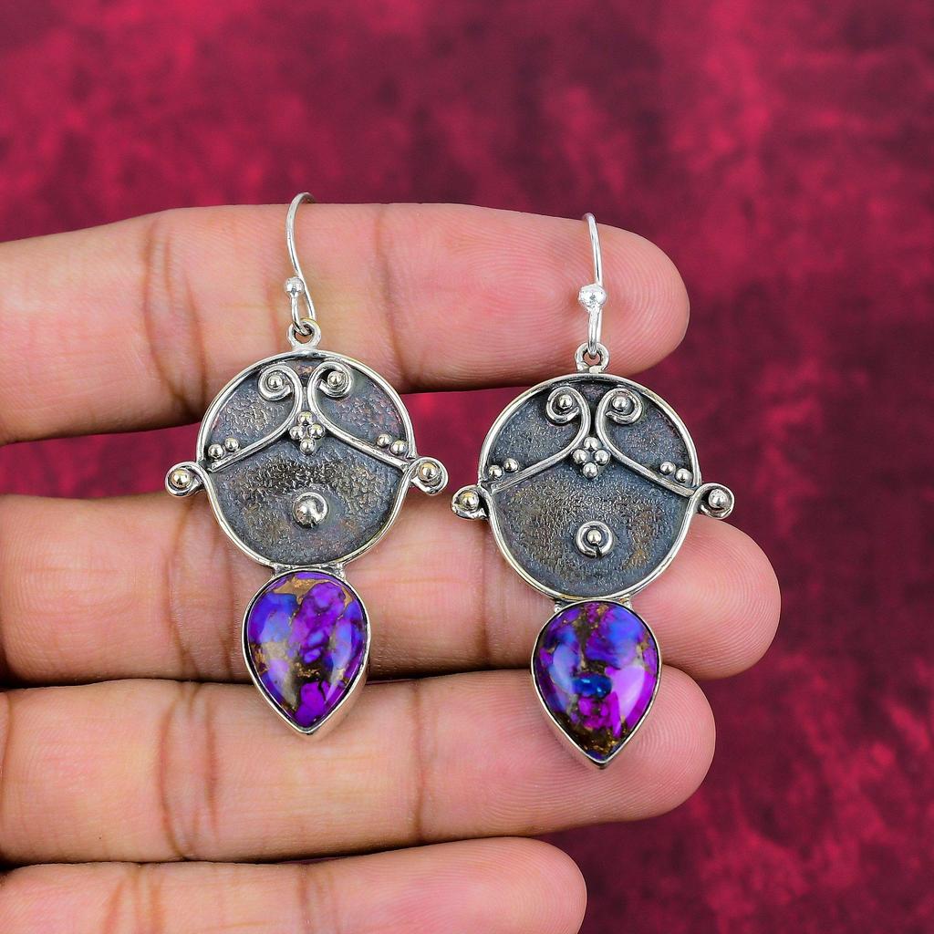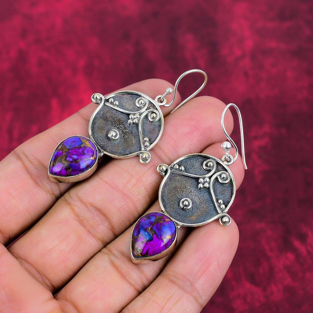 Серьги из фиолетовой меди и бирюзы, ювелирные изделия из цельного серебра 925 пробы, серьги с драгоценными камнями, подарок для нее, изящные ювелирные изделия ручной работы