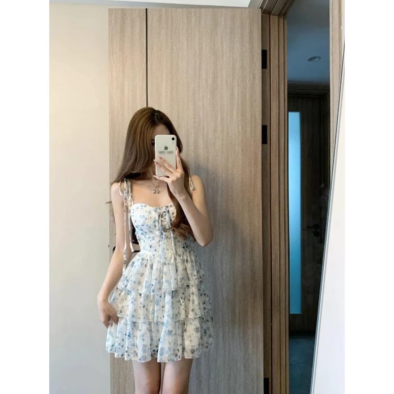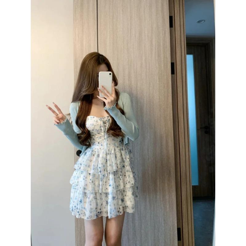 Французский элегантный комплект из 2 предметов, женское винтажное сексуальное облегающее платье с цветочным принтом + корейский повседневный тонкий кардиган с длинным рукавом, модный шик
