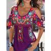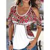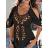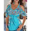 Новая летняя женская свободная плиссированная футболка с открытыми плечами и короткими рукавами с v-образным вырезом и принтом