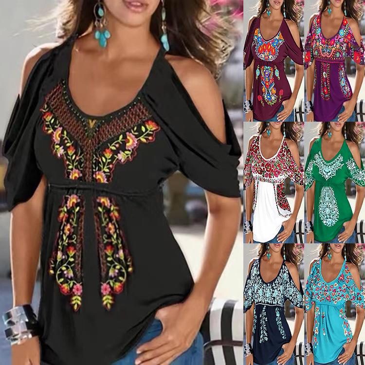 Новая летняя женская свободная плиссированная футболка с открытыми плечами и короткими рукавами с v-образным вырезом и принтом — купить товар онлайн с бесплатной доставкой по всему миру!