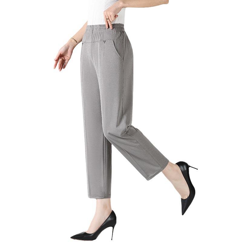 Женские брюки среднего возраста размера плюс, летние тонкие эластичные свободные прямые брюки с высокой талией, женские повседневные брюки