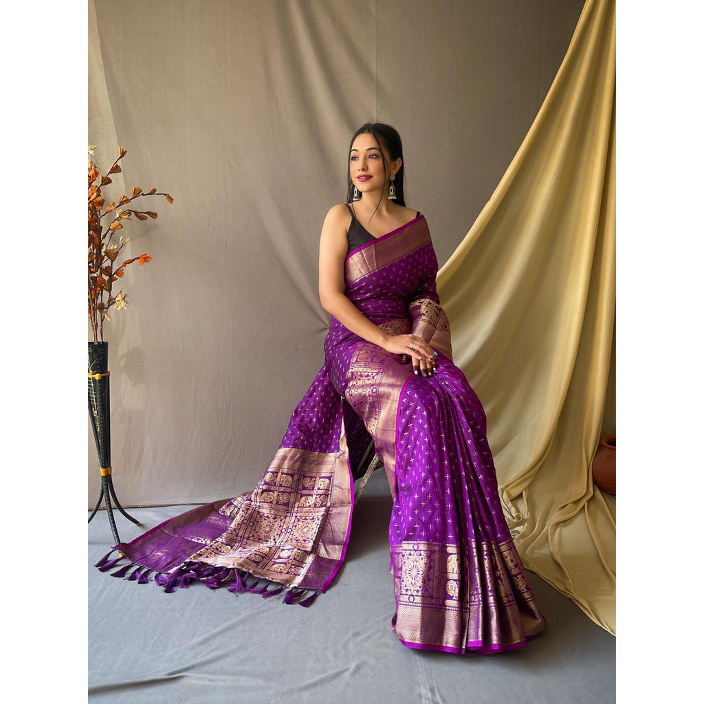 2)Ткань сари : Сари из чистого мягкого шелка с плетённой каймой зари из меди и золота и насыщенным паллу с красивыми мотивами и элегантным цветовым сочетанием