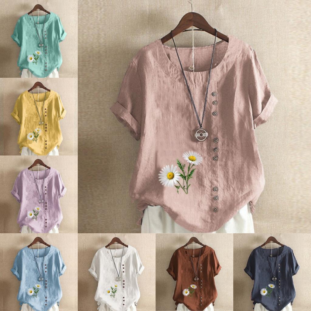 Женская модная футболка с круглым вырезом и коротким рукавом, повседневная хлопковая льняная рубашка с принтом хризантем, летняя блузка, топы больших размеров