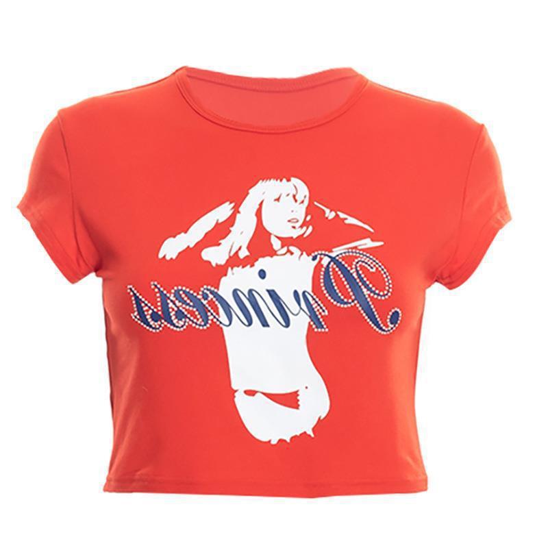 Европейский и американский летний пуловер Y2K с круглым вырезом, короткими рукавами и принтом со стразами и открытым пупком, повседневная женская футболка