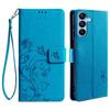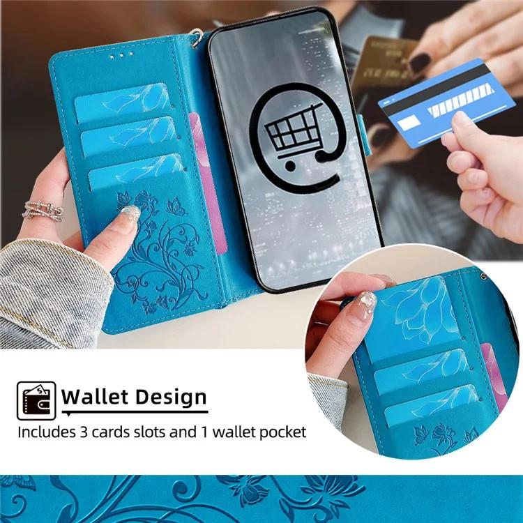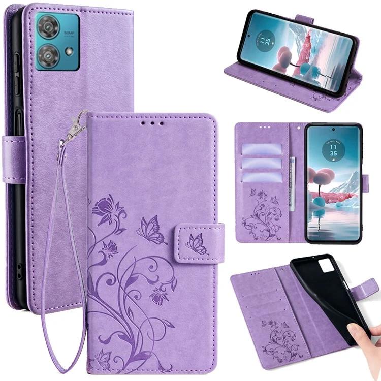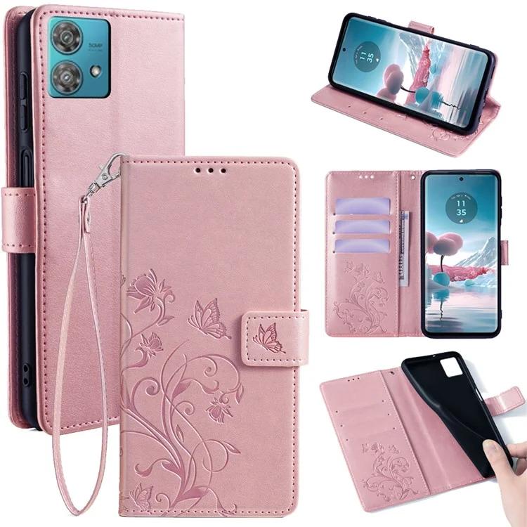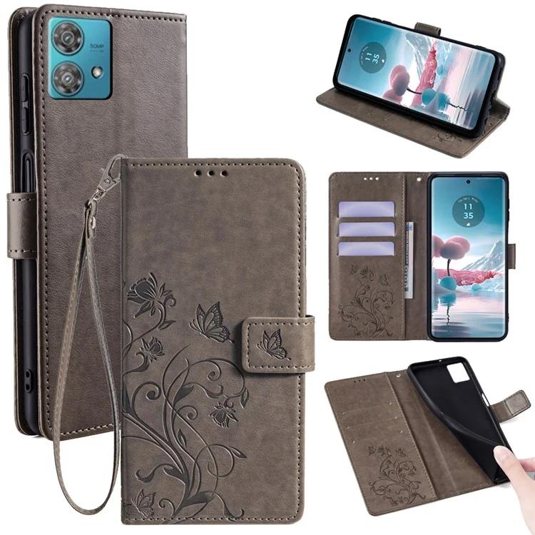 Чехол для телефона Motorola Edge 40 Neo 5G с ремешком на запястье, кожаный чехол-книжка с принтом в виде бабочки и цветка - синий