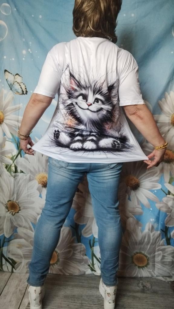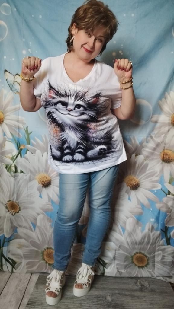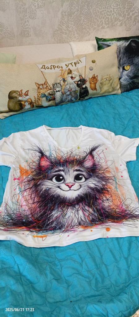 Футболка очень приятная к телу тканью.Принт великолепный,яркий и весёлый.Брала на размер 54.Не обтягивает,свободная.Моя ростовка 160.Сидит отлично,скрывает животик.Рисунок и спереди и сзади одинаковый,радует и меня и тех,кто идёт позади.Заряд позитива это важно.Спасибо продавцу.После стирки не линяет.Стираю на 30 градусах машинная стирка.Продавцу спасибо.Рекомендую.Думаю позже закажу ещё и с другими рисунками.Кошек люблю.))