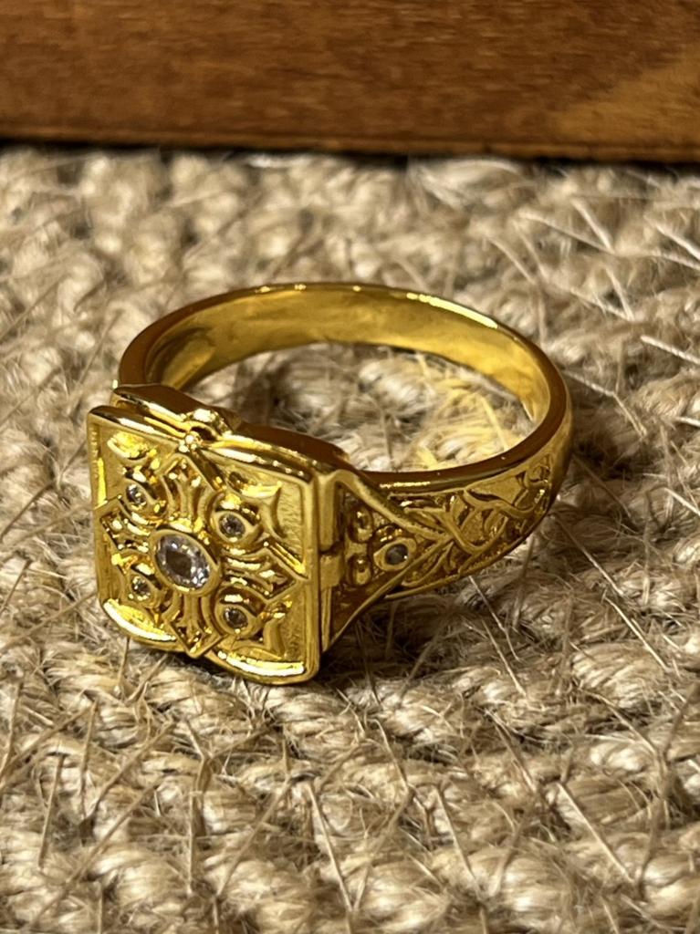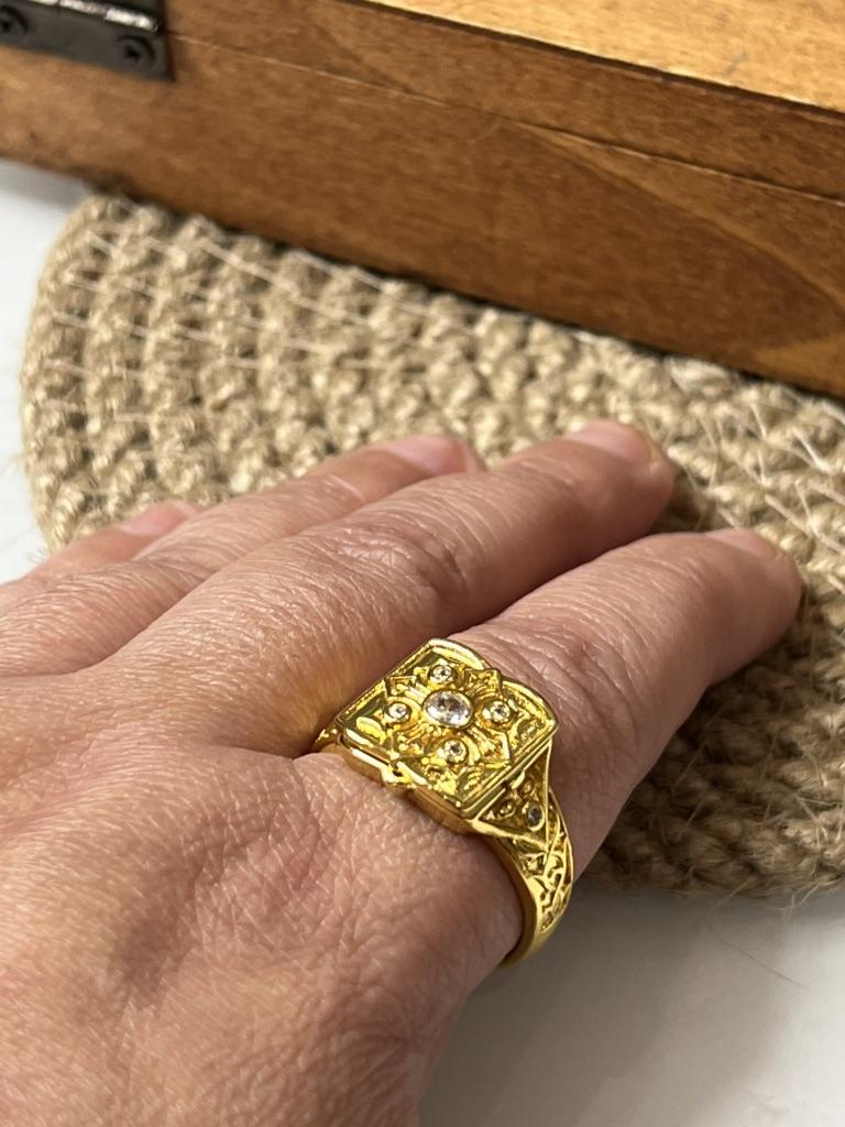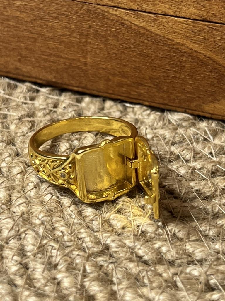 Кольцо медальон. Кольцо с секретом. На фото продавца кольцо выглядит посимпатичнее чем в жизни. Думаю от того, что на его фото золото приглушенного цвета, на самом деле оно желтое и сильно блестящее. Кольцо открывается и внутрь можно что то положить. Дизайн очень интересный. Украшено сияющими кристаллами. Не знаю почему я купила в золоте. Ведь в серебре это кольцо реально смотрится солидно. Задумка классная. Размер 13 это примерно 22 размер кольца на мужскую руку. Есть и маленькие размеры и вполне подойдет для женщин.