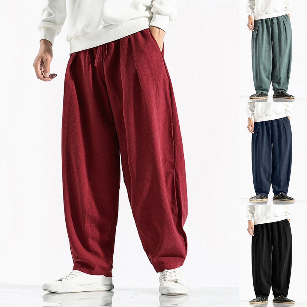 Мужские повседневные свободные однотонные льняные брюки, повседневные брюки из хлопка и льна, широкие брюки